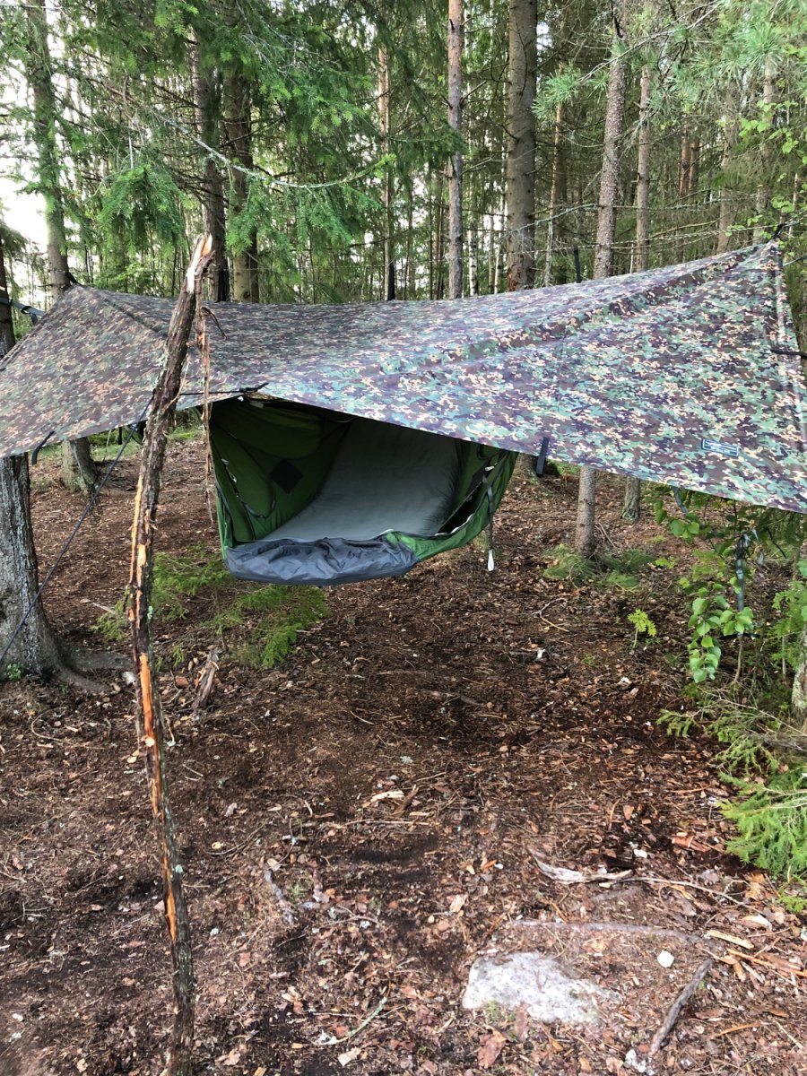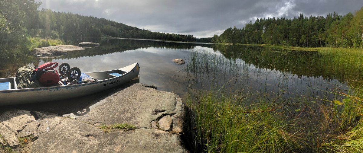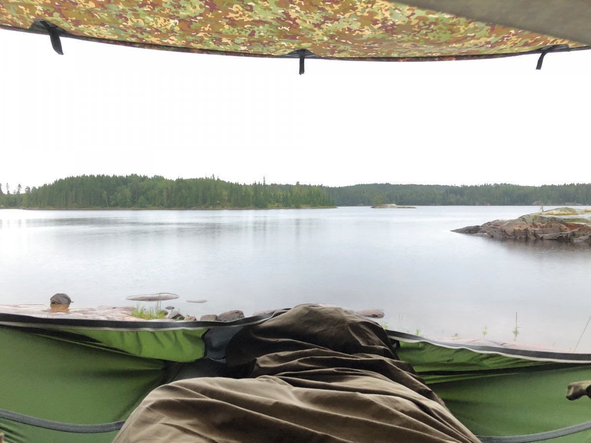 Am nächsten Tag aufgewacht haben wir erstmal die Morgenstimmung in der schwedischen Wildnis genossen, gefrühstückt und gemütlich unser Kanu gepackt. Der Plan für den Tag war es Dano 34 zu erreichen. Entspannt sind wir also in Richtung Norden gepaddelt nach einer kleinen Umtragestelle in Ed haben wir Dano 34 erreicht. Dort angekommen haben wir uns dafür entschieden unsere Hängematten direkt am See aufzuspannen. Nach einer Weile stand unser Aufbau und wir begannen ein bisschen die Gegend zu erkunden. Wir hatten einen kleinen Sandstrand neben uns und einen kleinen Bach der in den See mündete. Den Nachmittag haben wir viel mit schnitzen verbracht. Und am Abend haben wir einen Bohnentopf auf dem Spirituskocher aus unserem Ausrüstungs-Paket gekocht. Bevor wir schlafen gingen, haben wir unsere Ausrüstung unter ein Tarp verstaut da am nächsten Tag regen gemeldet war.