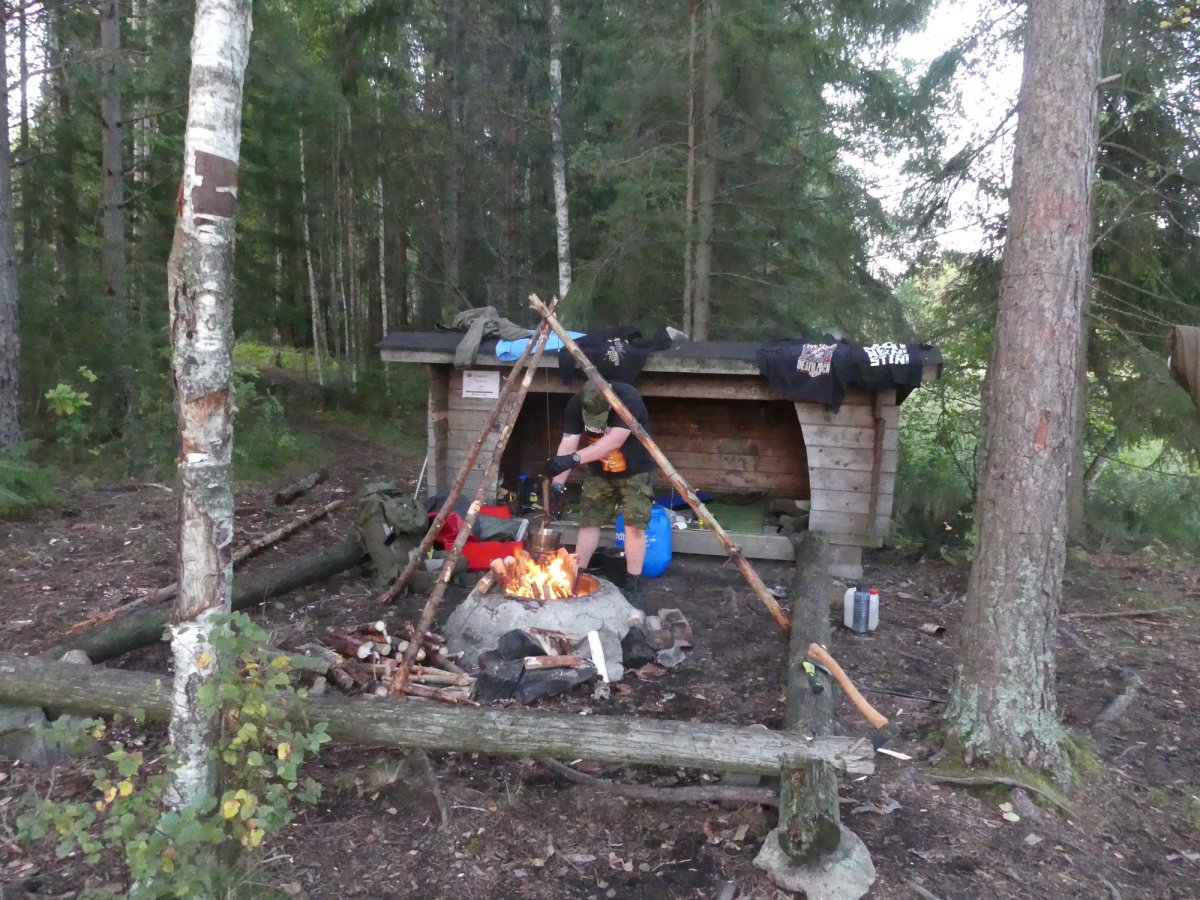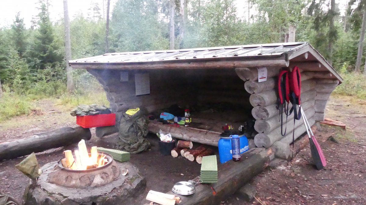 Zug nach Puttgarden. Dort ging es dann mit dem Scandtrack Express auf die Fähre nach Dänemark und damit in Richtung Schweden. Nach einer langen Busfahrt sind wir endlich in Lennartsfors angekommen und wurden gleich herzlich begrüßt. Nach einem kurzen Aufenthalt im Outdoor Camp haben wir gleich unsere Ausrüstung geholt und diese nach unseren Wünschen aussortiert. Und gingen zum See um unser Kanu zu bekommen. Nach einer kurzen Einweisung und ein paar hilfreichen Tipps ging es dann gleich auf‘s Wasser. Da wir uns dachten das alle Rastplätze im Norden und Süden ziemlich voll sein werden, entschieden wir uns mit unserem geliehenem Kanuwagen ein Stück Straße in Richtung Osten zu gehen. Bei Björnvik sind wir wieder in‘s Wasser gegangen und das kleine Stück in Richtung Dano 31 gepaddelt. Dort angekommen begannen wir gleich unsere Schlafplätze vorzubereiten. Einer von und hat in der Hängematte geschlafen und der andere auf einer Isomatte im unterstand. Danach ging es gleich an‘s Holz machen und danach dran ein Feuer zu entzünden. Da wir Birken als Brennholz hatten, war dafür auch genug Zunder vorhanden. Nun haben wir erst einmal eine leckere Reispfanne gekocht um uns zu Stärken. Danach ging es in‘s Bett um am nächsten Tag ausgeruht in den Tag zu starken.
