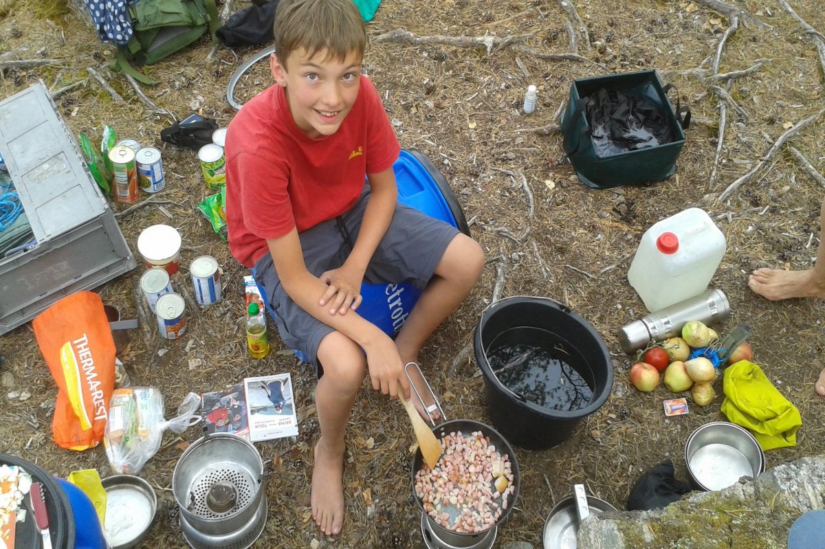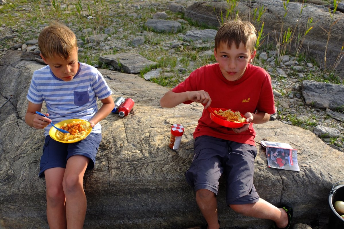 Papa hat beschlossen, dass die Eltern die lauschige Nacht nur im Innenzelt verbringen. Das erweist sich als fataler Fehler: Morgens um zwei klatscht schwerer Regen aufs Zelt und lässt beide in Panik in der Dunkelheit nach Außenzelt und Heringen suchen. Nur provisorisch befestigen wir das Ganze und das erweist sich als nächster Fehler: Der Wind dreht auf und das Knattern des losen Zeltes lässt an keinen tiefen Schlaf mehr denken. Die Kinder haben am Morgen selig geschlafen, ihr Zelt stand im Windschatten des Waldes; sie haben dafür beim Frühstück Probleme, weil der Wind das Müsli davonweht.