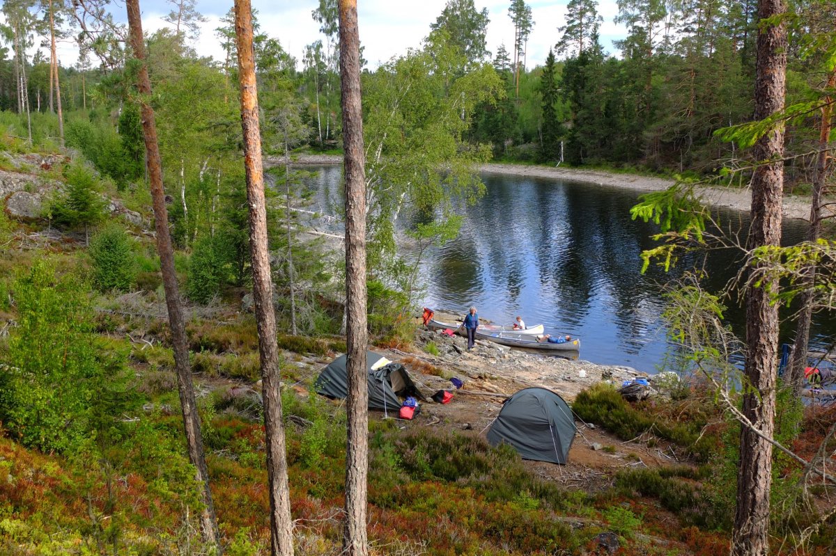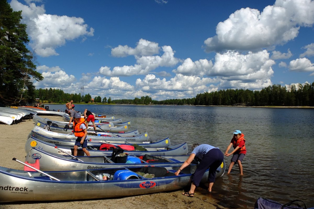 Zeitsprung: 10 Stunden später landet der Bus inmitten der schwedischen Wälder an einem rotgestrichenen Gehöft, vor dessen großer Wiese die roten Scandtrack-Zelte stehen. Emsiges Treiben herrscht bereits im "Outdoorcamp Höglund": Die Insassen von mehreren Bussen wollen mit Hotdogs versorgt werden und erwarten anschließend kaum die Übergabe von Kanu, Lebensmitteln und Ausrüstung. Trotzdem läuft alles in skandinavischer Ruhe ab und ab 14 Uhr schwärmt der ganze Ameisenhaufen in das Seengebiet aus und verteilt sich in kurzer Zeit in alle Himmelsrichtungen.
