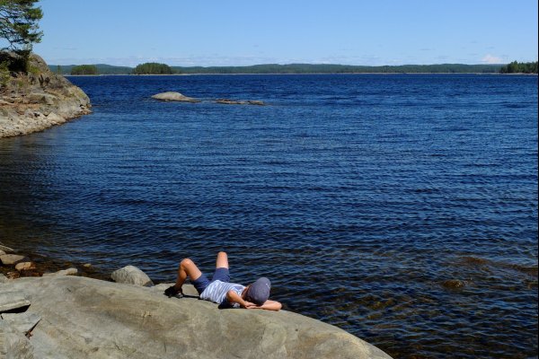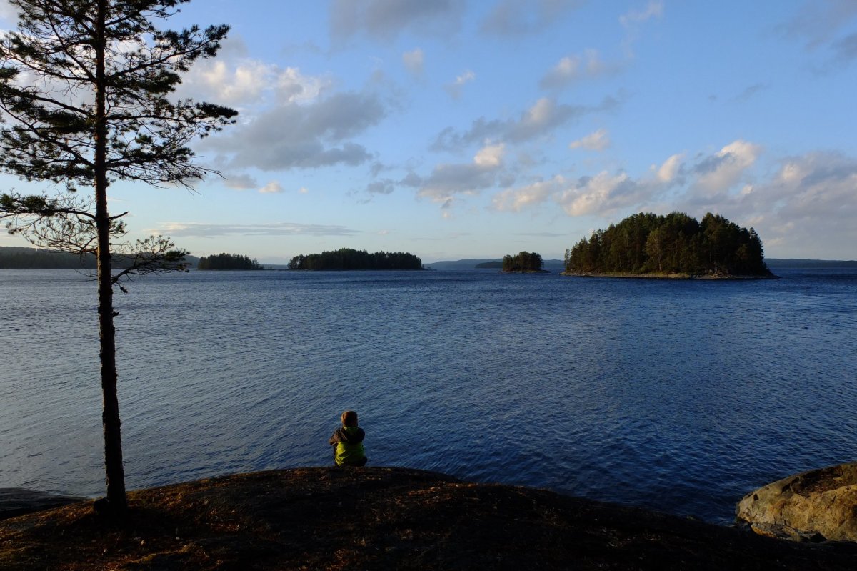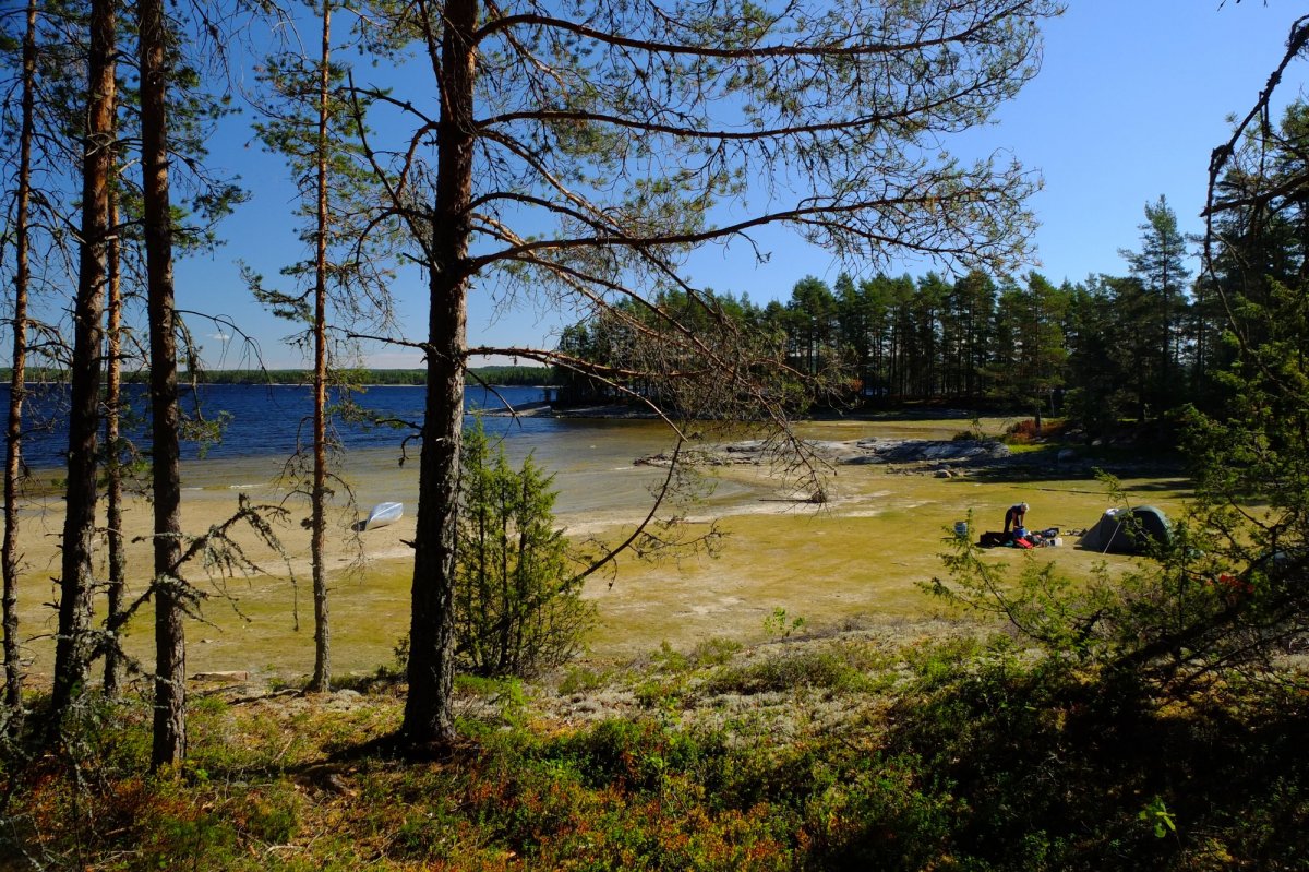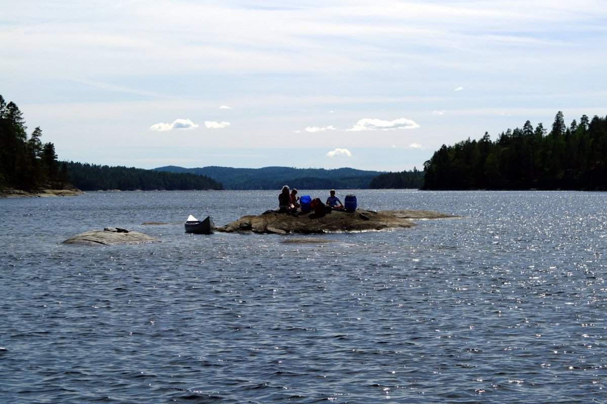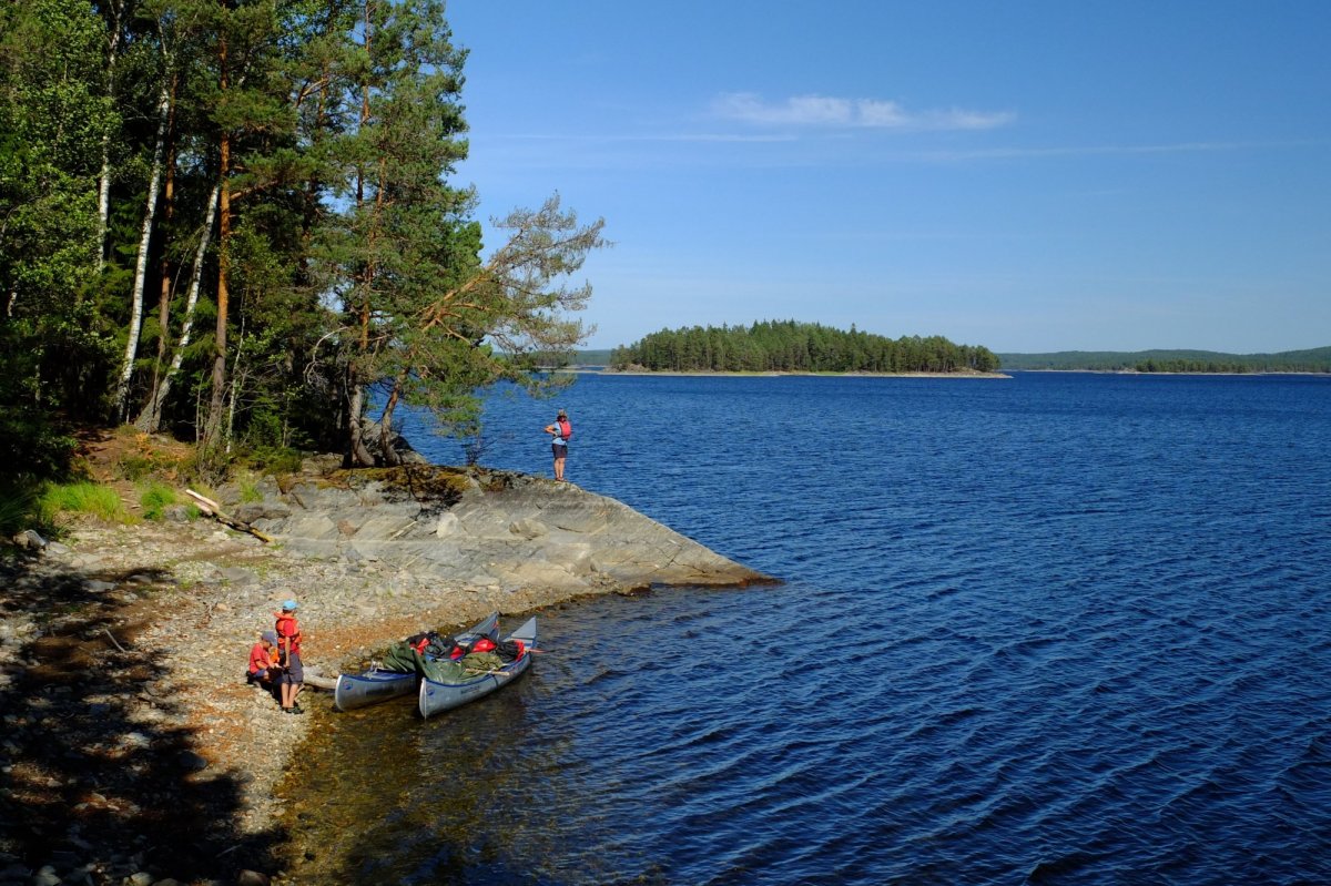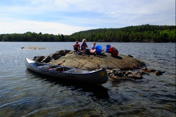 Wir sind fasziniert, welche Mengen an Gepäck die Kanus aufnehmen und wie lautlos und relativ mühelos wir damit durchs Wasser gleiten. Schon nach wenigen Kilometern finden wir eine ideale Bucht für die Nacht, die die anderen Kanuten in ihrem Vorwärtsdrang übersehen haben. Die Kinder machen erste Paddelversuche allein und holen Wasser von weiter draußen. Dass man das Seewasser trinken kann, ist schon eine kleine Sensation: Wir trinken eine Woche lang ungefiltertes "Seezüngle"-Wasser (in Anlehnung an eine Limonade vom Bodensee) und es bekommt uns ausgezeichnet. Dafür halten wir uns gewissenhaft daran, keine Seife - auch keine Bioseife - ins Wasser gelangen zu lassen, sondern Waschwasser immer einige Meter vom Ufer entfernt wegzukippen.
