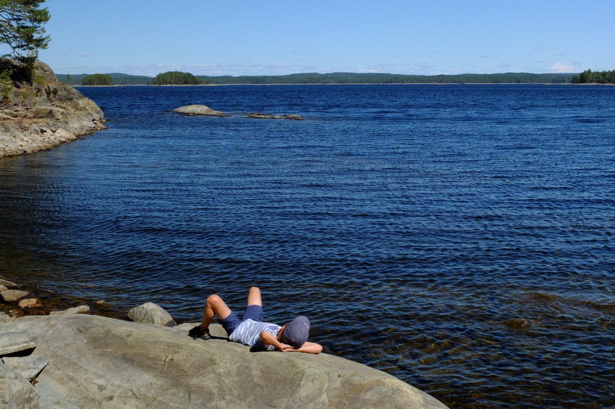 Schweden empfängt uns mit schwedischem Sommerhimmel: Weiße Haufenwolken, die vor blauem Himmel dahinsegeln. Der Sommer 2018 ist außergewöhnlich: So trocken, dass absolutes Feuerverbot herrscht, was unsere kleinen Feuerteufel hart trifft. Doch ein Blick in die Wälder macht selbst den Kindern klar, dass offenes Feuer hier Wahnsinn wäre: Die Flechten und Moose sind wie trockener Zunder! Die wenigen Blaubeeren sind klein und verschrumpelt, Pilze sehen wir keinen einzigen. Dafür gibt‘s auch nicht eine einzige(!) Stechmücke und die Seen sind so warm, dass man x-mal am Tag verlockt wird, hinein zu springen.
