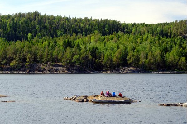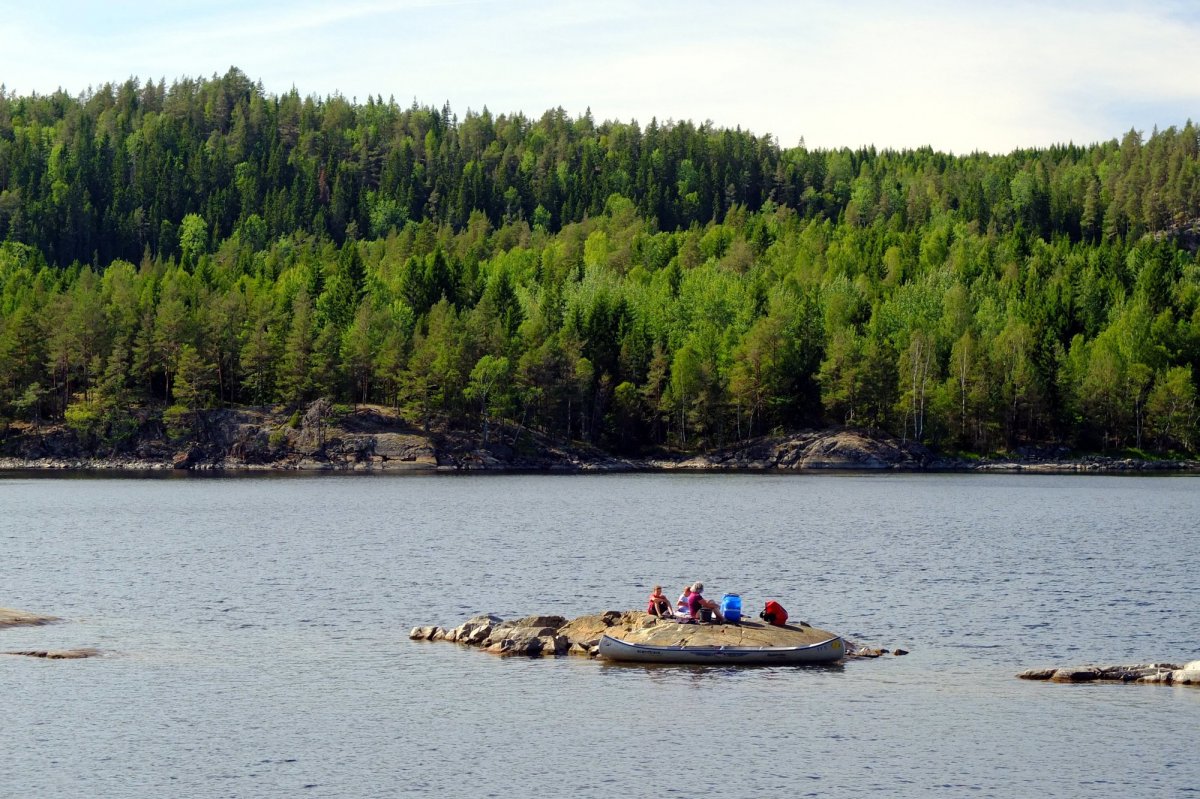 Heute geht es voller Tatendrang Richtung Westen, nach Norwegen hinein, weg von der Nord-Süd-Route, der die meisten folgen. Wir haben Seitenwind und zum ersten Mal schaukeln die Boote richtig, deshalb fahren wir wieder in der Formation ein Erwachsener, ein Kind pro Boot. Dann finden wir unsere Trauminsel, vielleicht 100 auf 50 Meter groß, mit offenem Blick nach Westen und somit Abendsonne. Ringsum sind noch andere Inseln und Schären, die die Kinder sofort auf eigene Faust erkunden. Zwar finden bis zum Abend alle „bewohnbaren“ Nachbarinseln ihre Abnehmer, trotzdem stellen die Kinder zufrieden fast, dass dieser Platz ihren Träumen entspricht.