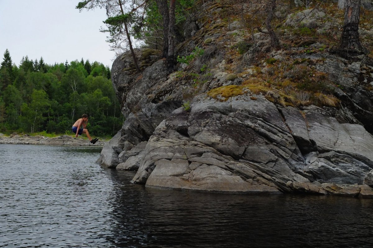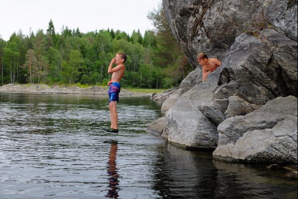 Dann entdecken die Kinder Boulderfelsen am Ufer und als sie feststellen, dass diese senkrecht in den See abfallen, gibt es kein Halten mehr: Ob Arschbombe, Kerze oder Hechter, unermüdlich springen sie in den See, obwohl die Sonne längst verschwunden ist,