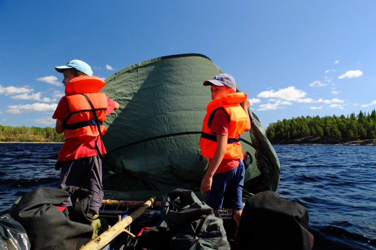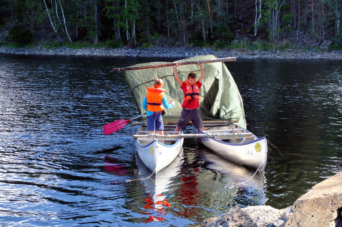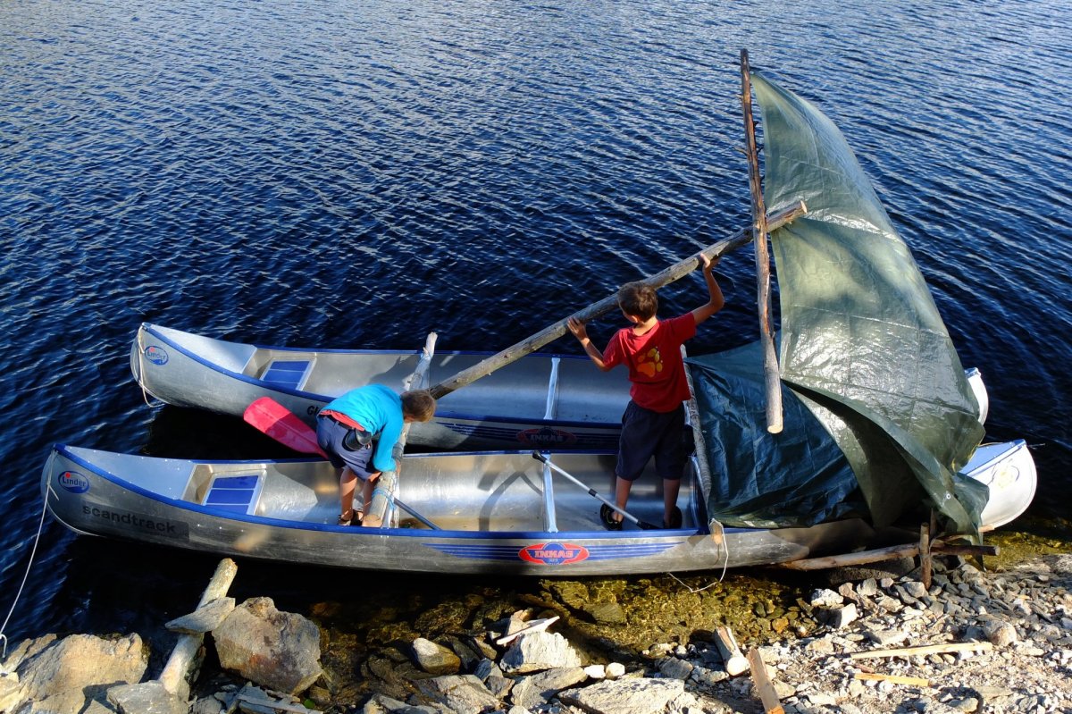 Nach der „Terence Hill-Pfanne“, die so gut schmeckt, wie wir das zu Hause nie für möglich gehalten hätten (mit goldgelb gerösteten Zwiebelchen, lecker!), bekommen die Kinder nochmal Auftrieb: Johannes erinnert sich, vor Trollön einige ältere Herren beobachtet zu haben, die ein Segel für ihr Boot gebastelt hatten und mit Riesenspaß auf und ab kreuzten. Nun versuchen die Jungs das Gleiche: An Land finden sie abgestorbene Äste, mit denen sie erst einmal die beiden Boote zum Katamaran zusammenbinden. Die Tarp-Plane nehmen sie als provisorisches Segel, das sie einfach in den Wind halten und siehe da: Sie entfernen sich von der Insel und verschwinden aus unserem Blickfeld. Die Eltern wechseln stumme Blicke, die Kinder haben ja zwangsläufig beide Boote mitgenommen – doch nach einiger Zeit kommen sie mühsam zurückgepaddelt.