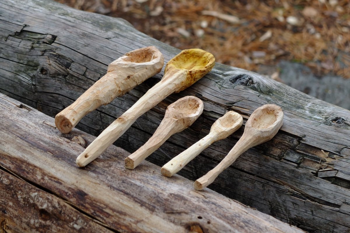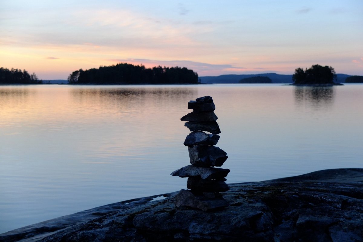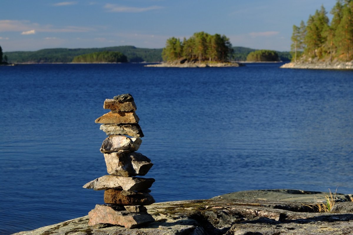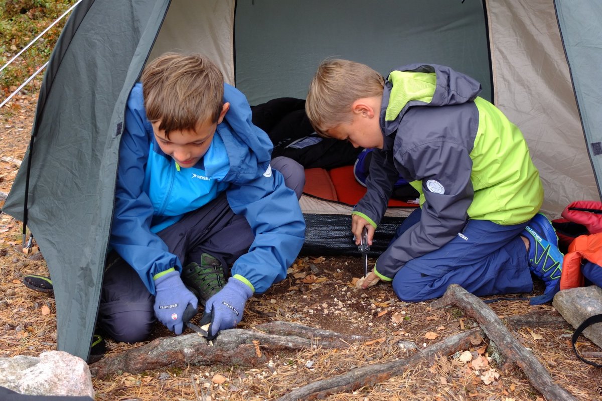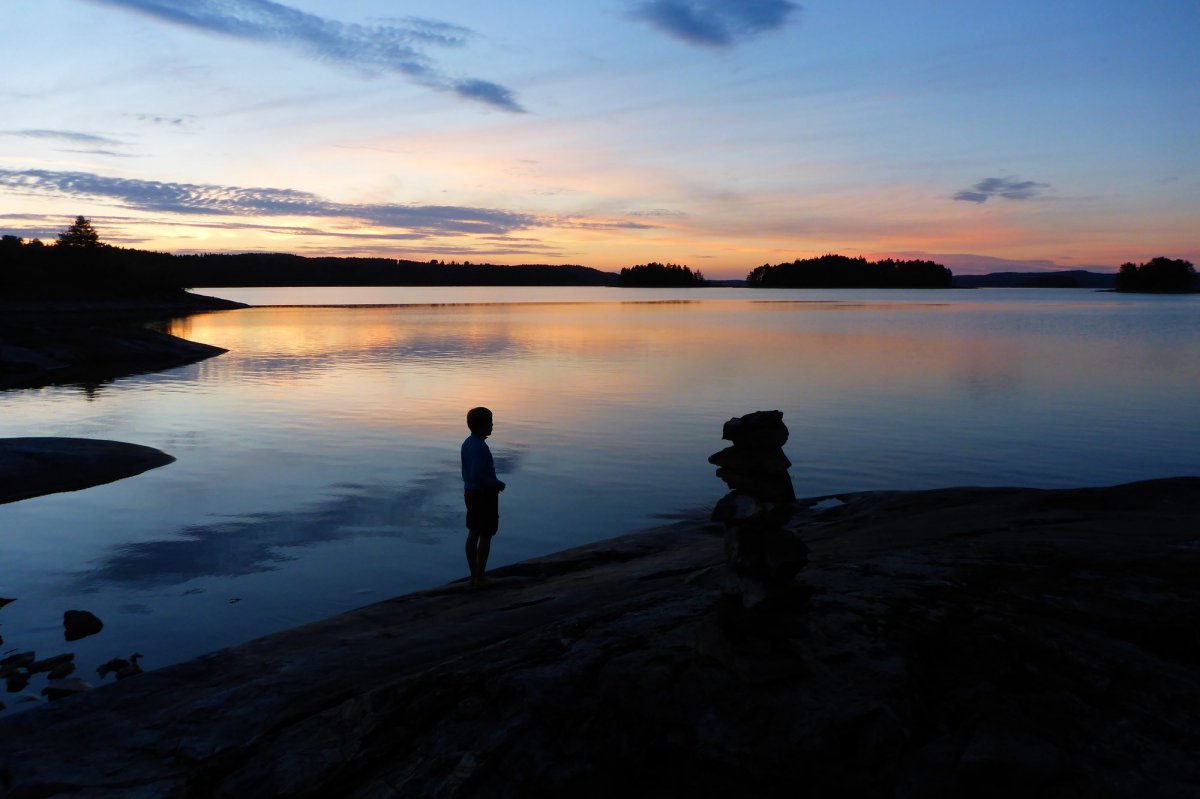 Das ist kein Tag zum Paddeln. Wir sind heilfroh, dass wir gestern so weit gekommen sind und uns heute einen Ruhetag erlauben können. Unsere Hoffnung, dass der Wind nachlässt, erfüllt sich nicht, im Gegenteil: Er wird zum Sturm, der die mühsam gebauten Steinmännchen am Ufer reihenweise umwirft, so dass wir das elterliche Zelt auch in den Wald verlegen müssen. Der Tag vergeht trotzdem erstaunlich schnell mit Lesen, Dösen, Kochen und Löffelschnitzen. Die Kinder suchen in der Tiefe der Lebensmitteltonne nach bisher übersehenen Leckereien; es gibt letztendlich Cornflakes, in Nutella getaucht.