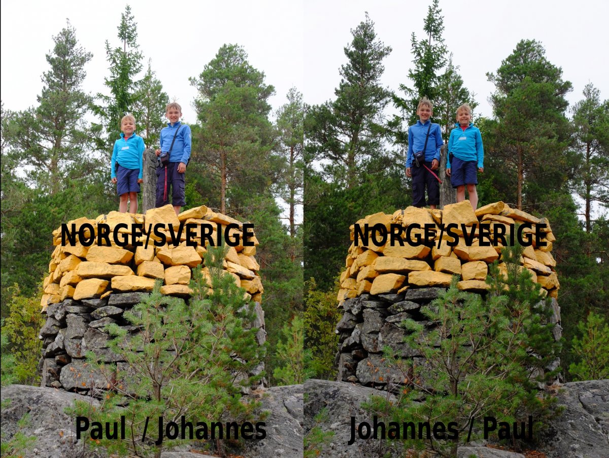 Heute steht Trollön, die Grenzinsel, auf dem Plan. Sie ist nur eine gute Paddelstunde entfernt. Einsam ist sie allerdings nicht, irgendwie zieht hier der Kanuten-Hauptstrom vorbei, außerdem sind zwei DANO-Rastplätze hier. Wir umrunden das Eiland einmal zu Fuß und suchen den Grenzstein inmitten der Insel. Ein großer Kegel aus Granitsteinen markiert die Grenze und wir machen die obligatorischen Bilder: Einmal ist Johannes Schwede und Paul Norweger, ein Bild später umgekehrt.