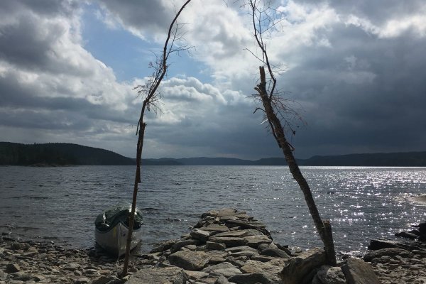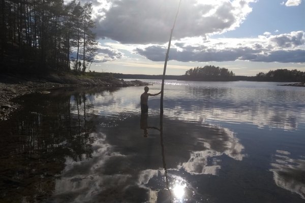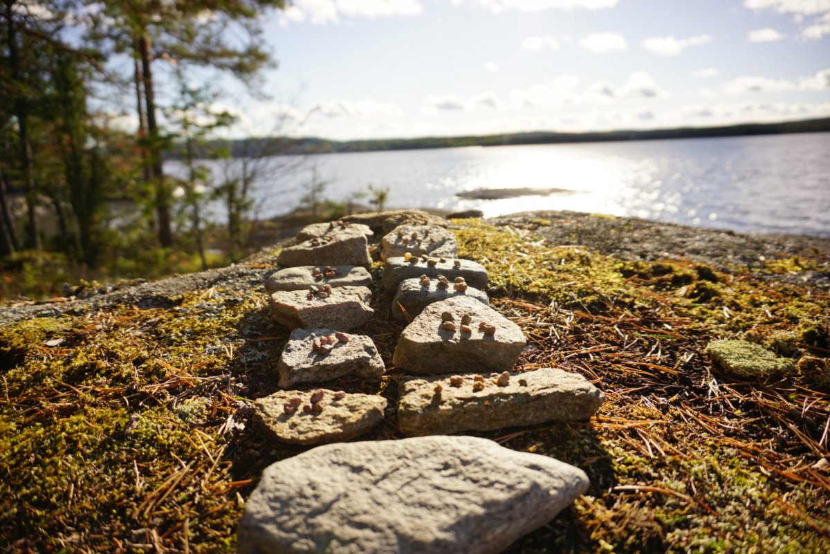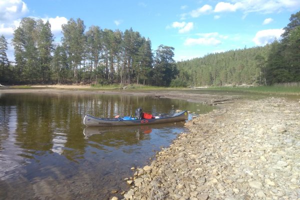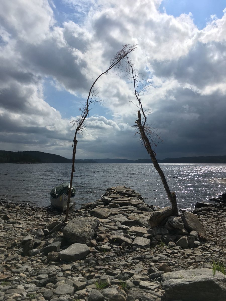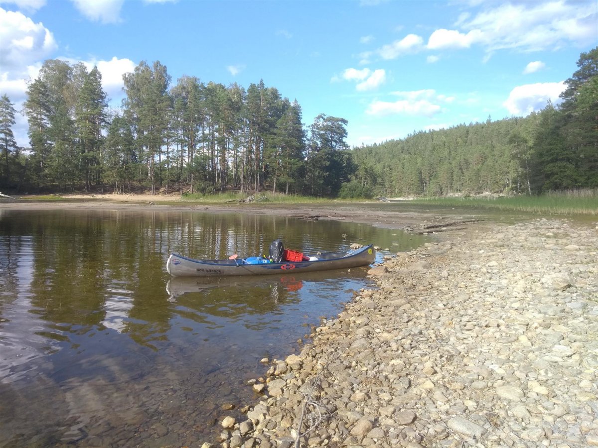 Wir fahren durch altbekannte Landschaften. Zwischenpause auf der Elchknocheninsel. Spontan beschließt R sich ein Souvenir mitzunehmen. Die guten Lagerplätze in der Nähe sind bereits belegt. Wir kommen weiter als geplant und landen auf einer langgezogenen Insel in der Mitte des Sees. Sie ist von Ameisen bevölkert. Wir bringen ihnen einen Tribut dar. Nach beschlossenem Nicht-Angriffspakt, dürfen wir hier eine Nacht verbringen.