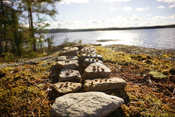 Es ist laut. Der Wind heult durchs Zelt. Außerdem ist es kalt. Unsere wärmsten Sachen sind nass. Mit dem Kanu können wir heute nicht fahren. Zu starker Wellengang. Wir bleiben lieber im Zelt und versinken in der Scheibenwelt. Zum Essen müssen wir doch in den kalten Wind nach draußen. Nach ersten Erfahrungen mit davonwehendem Milchpulver, hängen wir unsere nassen Sachen auf. Wir hoffen, dass die Wäscheklammern und das regenlose Wetter halten. Irgendwann kommt die Sonne heraus. Es ist später Nachmittag. Wir verlassen das erste Mal nach dem Frühstück wieder das Zelt. In einer windgeschützten Mulde zwischen den Steinen genießen wir unsere ersten Sonnenstrahlen in Schweden. J sammelt Steine um daraus ein Kalaha-spielfeld zu bauen. Die erste Partie wird auf einem Steinplateau in der Abendsonne ausgefochten. Der starke Wind hat unsere Wäsche getrocknet. Der Tag ist gut ausgegangen!