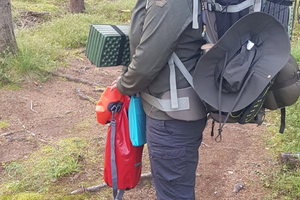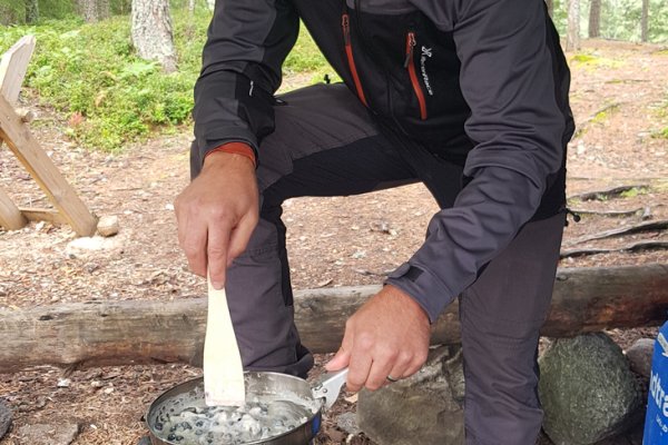Am nächsten Morgen trafen wir dann bereits um 8 Uhr im Camp Höglund ein und konnten endlich, nach Überwindung der „Adventure Road“ mit dezent mehr als 20kg Gepäck pro Person unsere Ausrüstung übernehmen und in unser Abenteuer starten. Bei heiterem Wetter stachen wir so schon vor 10 Uhr in See. Unser Tagesziel stand schnell fest, da die Wetter App für den Sonntag ausgiebigen Regen vorhersagte. Also: ein Dano mit Windschutzhütte suchen, in der wir den Regentag trocken überstehen können. Dieser Platz war recht schnell in Dano 15 gefunden. Nach dem Ausladen des Gepäcks machten wir uns daran uns einzurichten und bereits Vorkehrungen gegen den Regen zu treffen. Hier ließ sich der Regentag dann auch gut aushalten. In den kurzen Regenpausen vertrieben wir uns die Zeit mit dem Erkunden der Insel, Sammeln von Blaubeeren und immer wieder mir Film- und Fotoaufnahmen der schönen schwedischen Natur, die trotz Regen nichts von ihrer Schönheit einbüßt. Zum Mittagessen gab es dann leckere Pfannkuchen mit den selbstgepflückten Blaubeeren.