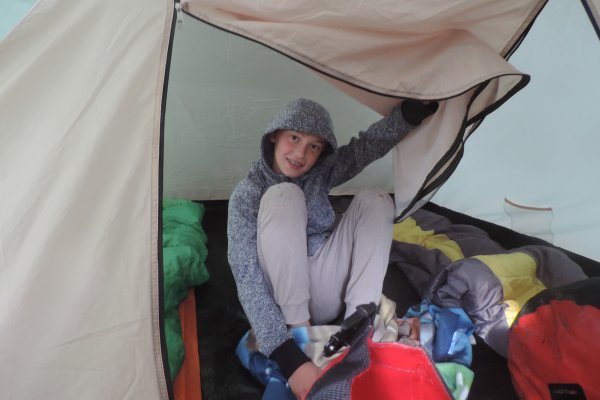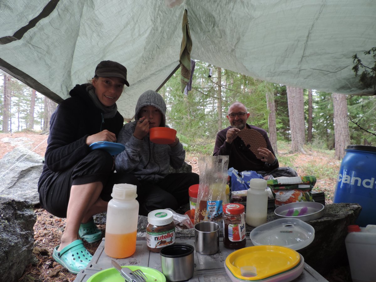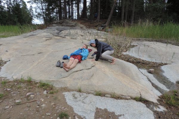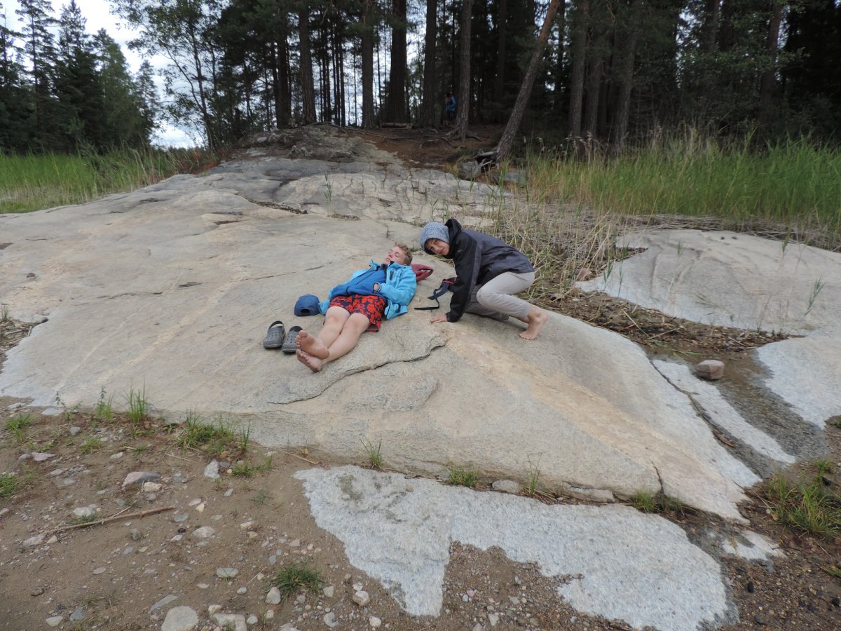 Am Sonntag genossen wir ein gediegenes Frühstück, bei dem es auch Kornflakes mit angerührter Trockenmilch gab, was wir so noch nicht kannten. Trockenmilch wird wohl künftig eine echte Alternative auf Reisen. Dann packten wir zeitig zusammen. Der Regen hatte aufgehört und es war mäßig windig. Wir packten strategisch das Veggie- und das Meetboot und ruderten weiter. Doch die Strömung erfasste das Veggie-Boot und trieb es vor die Sandsteinfelsen. Jede Bemühung gegen die Strömung zu rudern, blieb erfolglos. Begleitet von der Angst mit Kind und allem Hab -und Gut zu kentern, überlegt man jeden Ruderschlag vielfach. Wir hatten die meisten Dinge am Boot befestigt, aber der Inhalt der Klappkiste würde bei einer ungewollten Rolle zweifellos in den dunklen Tiefen des Fjord verschwinden. Valentin und Bianca blieben erstaunlich ruhig und hoch konzentriert, aber die Verzweiflung der Veggie-Boot Besatzung wuchs. Das Meetboot kämpfte sich frei , was aber viel Kraft erforderte. Die Fjord Mündung hatte jedoch so schöne Platzangebote, dass man wahrlich nicht weit und schon gar nicht unbedingt gegen die Strömung fahren musste. Wir bugsierten die Boote vorsichtig um die Sandfelsen in die Fjordmündung, die auf der Wasserkarte als Sackgasse abgebildet war. Kurzentschlossen paddelten wir noch etwas in der Fjordmündung herum und fanden schnell den nächsten tollen Lagerplatz. Was erlebt man da so in der Wildnis? Einsam, allein und mit ausgeschalteten Handy´s. Wir konnten einfach mal eine Weile „chillen“. Angeln, Wasser filtern, reden, spielen, lachen und lecker essen. Einen Inselrundgang machen und sich wie ein Wikinger fühlen. Die Boote befanden sich kopfüber am Ufer und in Sichtweite.