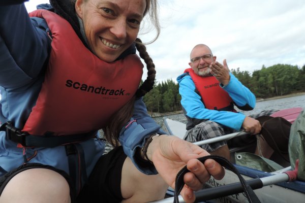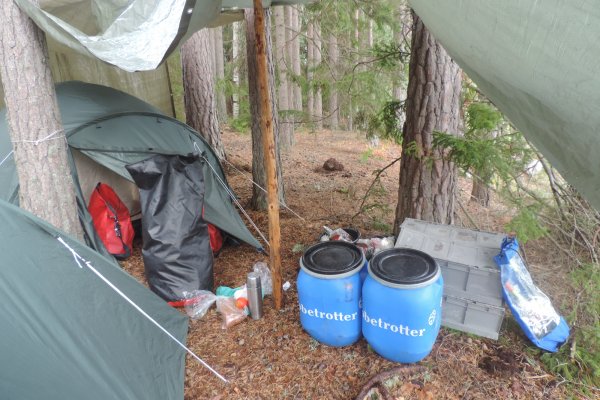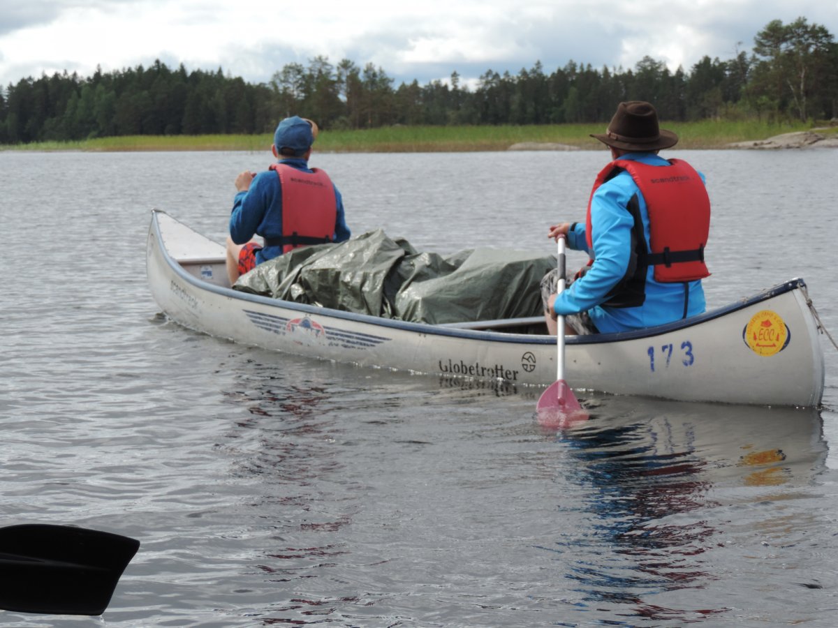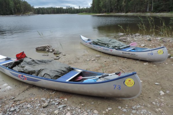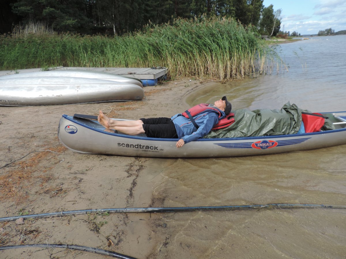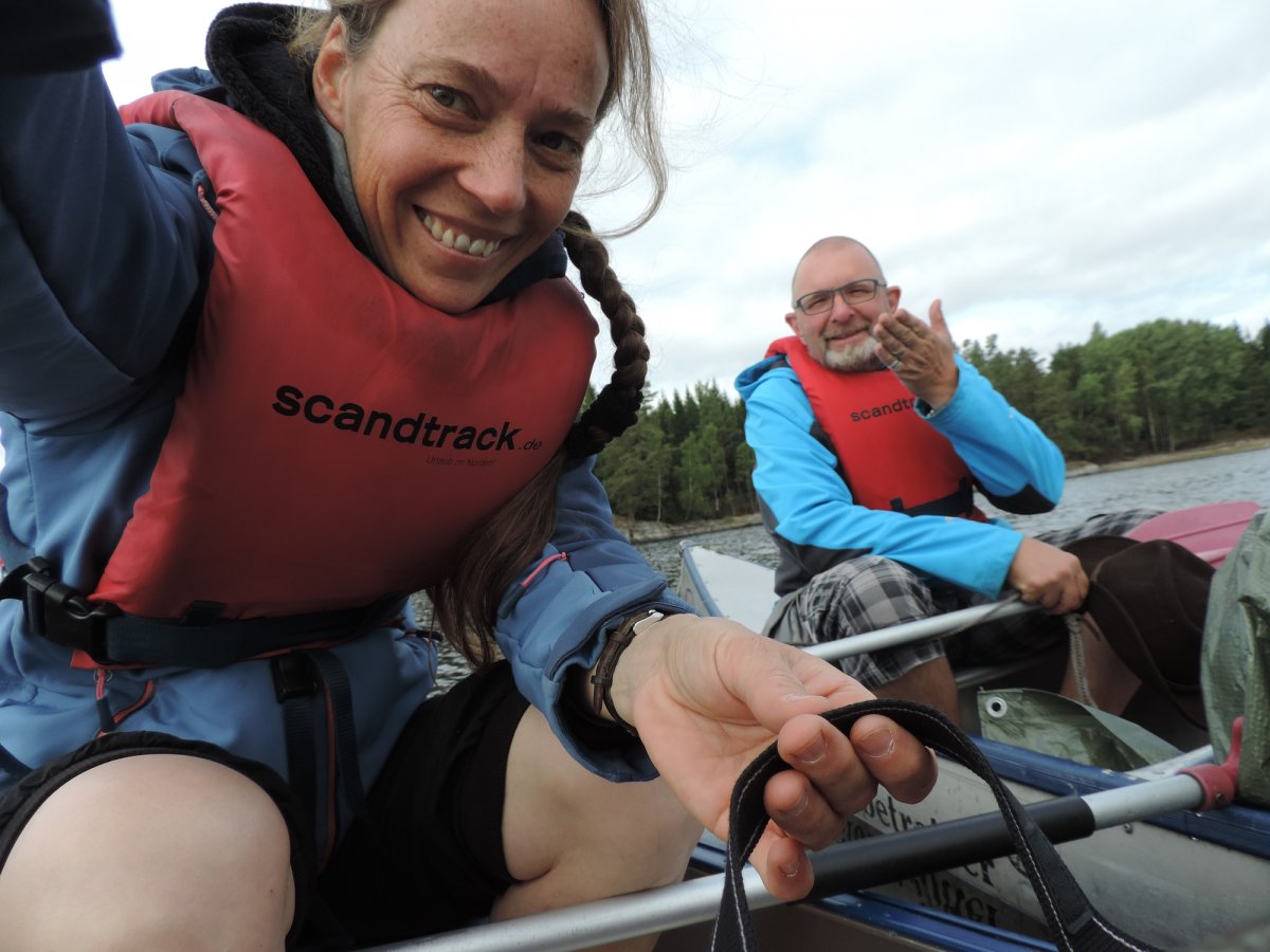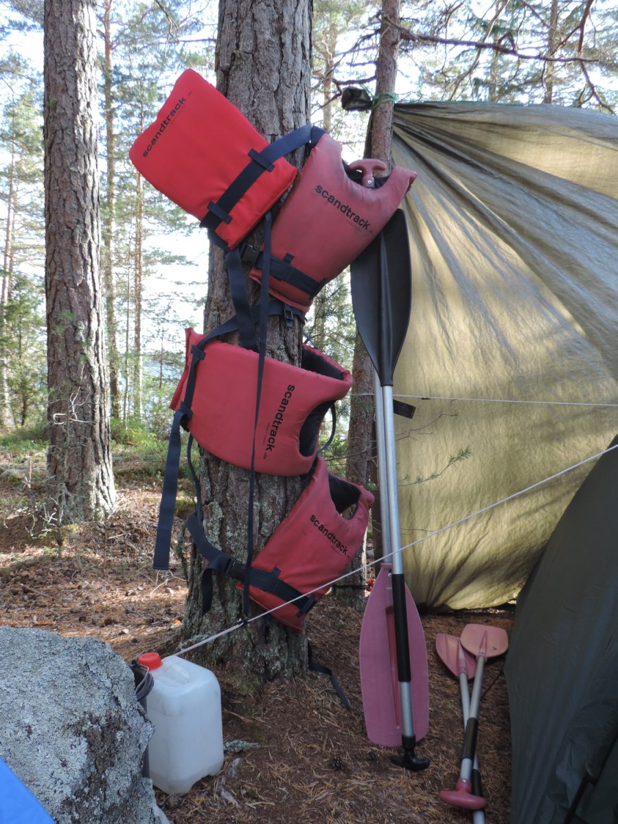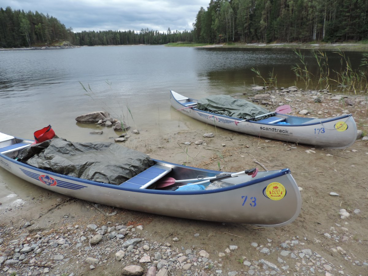 Scandtrack schien wie zuvor versprochen wirklich an alles gedacht zu haben und uns wurde reichlich Material mitgegeben. Die Schwimmwesten wurden angepasst und der Frischwasserbehälter im Camp aufgefüllt. Durch das sommerliche staatliche Feuerverbot wurden von Scandtrack noch extra viele Lebensmittel zugepackt, die man als „kalte Küche“ verstand. Für Bianca und Valentin gab des die Tonne mit den vegetarischen Lebensmitteln. Für Jonathan und mich gab es das normale Fass mit Würstchen, Schinken und zahlreichen anderen leckereien. Hieraus ableitend bildeten wir zwei Kanu-Teams, die wir liebevoll das „Veggie-Boot“ und das „Meet-Boot“ tauften.