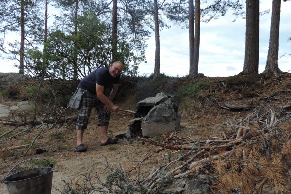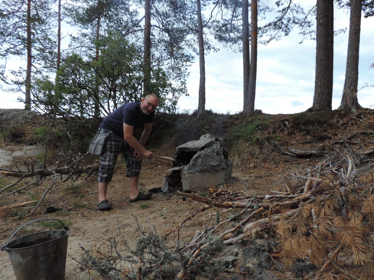Nach der Zeit der Einsamkeit stand uns der Sinn danach, die Dano - Sammelplätze aufzusuchen. Dort sollten uns Feuerstellen, ein Dano-Holzhaus und eine Bio-Toilette erwarten. Kaum dort angelandet, nutzten wir letztere erst einmal ausgiebig aus. Auf dieser Insel lernten wir ein Paar aus Münster kennen und entdeckten einen Lehmbackofen. Scandtrack hat in die Lebensmitteltonnen tatsächlich Mehl und Backpulver verstaut und wir konnten einen Teig zubereiten. In den Schalen unserer Trangia bereiteten wir die weltbeste Pizza zu und der Lehmbackofen buk sie knusprig lecker. Dummerweise ist hierbei der Ofen teilweise eingestürzt, da durch die Glut der Lehm herausgebrochen war. Das hat mich sehr betroffen gemacht, aber den Abend genossen wir am Feuer mit den Münsteranern und entschieden dann, auf dieser Insel eine weitere Nacht zu bleiben, um den Ofen reparieren zu können. Jonathan protestierte ohnehin gegen das ständige Abbauen, Einpacken und Weiterreisen, so dass ihm diese Entscheidung sehr gelegen kam. Valentin und ich setzten den Ofen am Folgetag in Stand. Bianca schoss ein Foto nach dem nächsten.