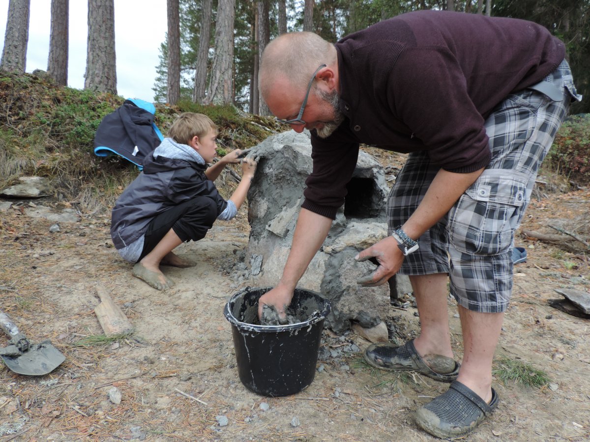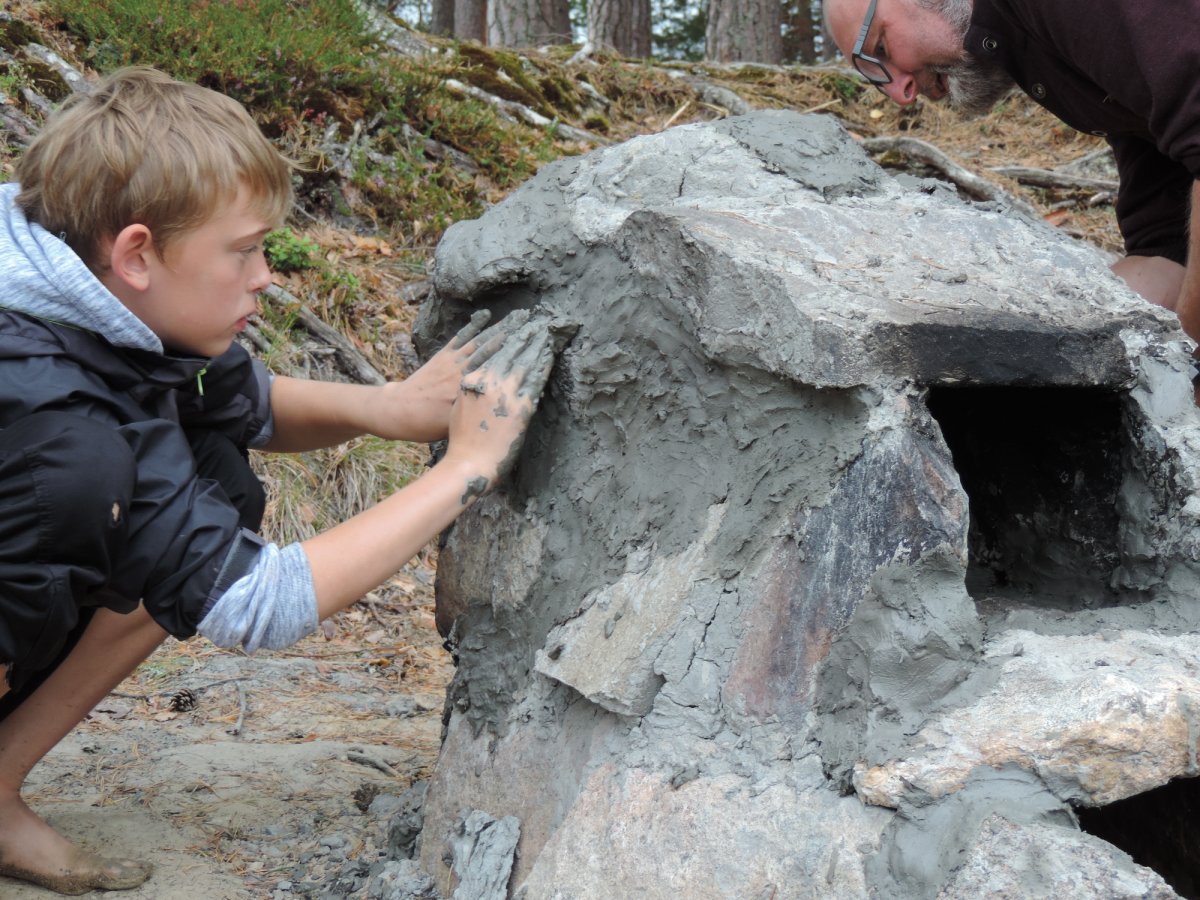 Die Fotos amüsieren uns hier sehr, weil man gar nicht weiß, wer von uns beiden hier mehr das Kind gewesen ist. Der Lehm war direkt am Ufer abbaubar und hatte eine perfekte Konsestenz. Er roch nicht und es schien, als hätte das glasklare Fjordwasser den saubersten Lehm der Welt hervorgebracht. Die inzwischen angelandeten Kanufahrer und Fahrerinnen dankten uns unsere Mühen sehr. Sie freuten sich, den Ofen in den Abendstunden für sich nutzen zu können. Tatsächlich witzig war Biancas Erkenntnis, dass wir rund eintausend dreihundert Kilometer von zu Hause entfernt waren und an diesem Abend eine Reihe netter Menschen aus unserer Geburtsstadt Recklinghausen mit uns hier am Dano am Feuer saßen. Wir genossen die witzige Runde.