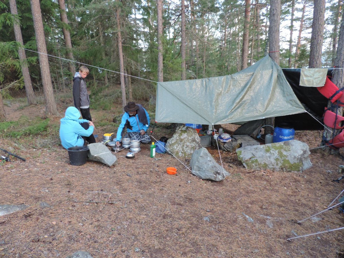 Nachdem wir die Kanuten zugewiesen bekommen und beladen hatten, übten wir die ersten Paddelschläge, da unsere Familie noch nicht viel Erfahrung mit Kanu fahren hatte. Wir ruderten sehr erfolgreich wenige hundert Meter am Ufer entlang, bis zu einem Camping Platz. Von dort konnten wir bequem unsere persönlichen Sachen aus dem Auto zuladen, wenngleich der Regen unaufhörlich auf unsere Regencapes prasselte. Wir hatten von vornherein keine sportlichen Höchstleistungen für die Tagesstrecken angepeilt und ruderten völlig entspannt über den Fjord. Es mögen wirklich nur wenige Kilometer Fahrtstrecke gewesen sein, aber schon hier schien ein Fleckchen schöner als das Andere zu sein. Und mit dem schwedischen Jedermannsrecht sollte es uns erlaubt sein, überall unser Zelt für eine Nacht aufstellen zu können. Da wir pfadfinderisch erfahren sind, war uns klar, dass Zeltaufbau und Essenszubereitung generell Zeit in Anspruch nimmt und so nahmen wir den für uns paradiesischsten Platz in Augenschein. Unsere Prämissen: Hauptsache einsam. Wildnis. Abenteuer. Ruhe. Hier hätte man überall seinen Anker werfen wollen. Wir bauten die Zelte auf, spannten Regenplanen über unser Camp.