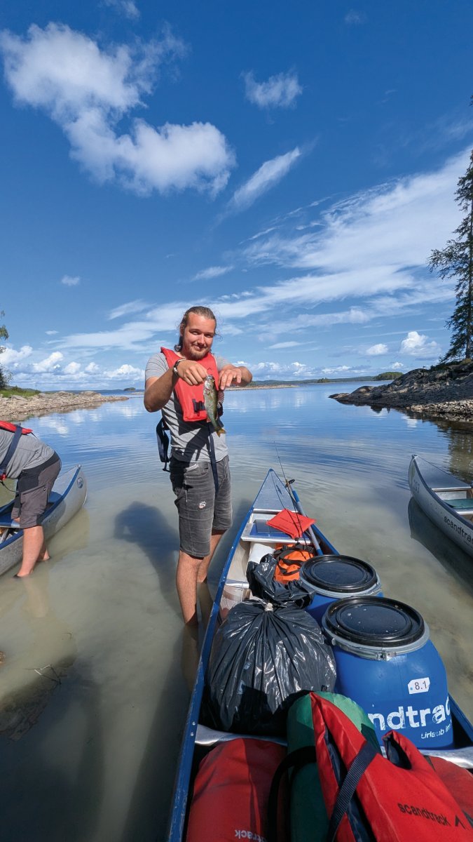 Nach dem Frühstück bauten wir das durchnässte Camp ab und beluden die Kanus. Holger zeigte uns auf der Karte die heutige Tagesetappe: Wieder lagen sechs Kilometer Kanufahrt durch die wunderschöne schwedische Natur vor uns. Auf halber Strecke sorgte Holger selbst für eine freudige Überraschung: Ihm gelang es, einen Hecht zu fangen! Die Gruppe freute sich bereits auf frischen Fisch zum Abendessen.