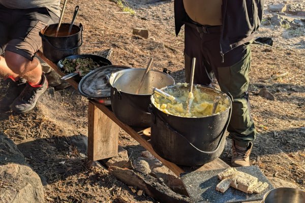 Da wir bereits um 13:30 Uhr mit dem Aufbau fertig waren, gab es ein entspanntes, aber abwechslungsreiches Mittagessen, das von Bockwurst über Instant-Nudeln bis hin zu Milchreis reichte – stets unter der kulinarischen Beteiligung Constantins. Anschließend planten wir die Verpflegung für die kommenden Tage. Für den Abend stand Mirkos „Terence Hill Pfanne“ auf dem Programm, gefolgt von „Elchkötteln“ (Teigkugeln mit Nutella-Überzug), deren Teig Christina und Xenia ansetzten. Constantin und ich füllten währenddessen unseren Holzvorrat wieder auf.