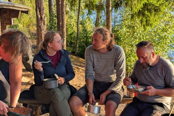 Maren, Konstanze und Christina begannen derweil mit den Vorbereitungen für das Abendessen: Es gab grünen Salat und Gemüsereis. Holger briet den frisch zerlegten Hecht in der Pfanne, während Mirko aus den Resten eine fantastische, leckere Fischsuppe zauberte. Die Gruppe kam zusammen und genoss den unverhofften Gaumenschmaus: frischen Hecht, die Suppe, Salat und Reis. Kaum zu glauben, dass wir mitten in der Wildnis, fernab von Supermarkt und Restaurant, ein solches Festmahl serviert bekamen!