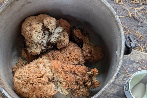 Und unglaublich, aber wahr: Die Pilzsucher kehrten mit einer Sensation zurück – sie hatten nicht nur Pfifferlinge, sondern tatsächlich zwei Krause Glucken gefunden! Selbst Holger war skeptisch, doch ich konnte die Zweifel zerstreuen. Holger und ich machten uns sofort daran, diesen seltenen, blumenkohlartigen/schwammartigen Pilz zu reinigen.