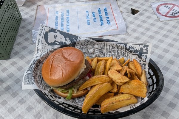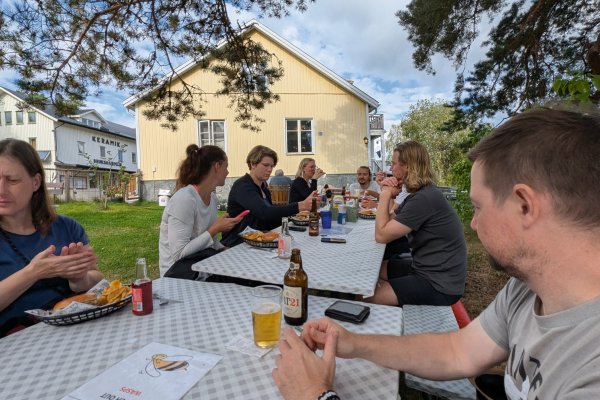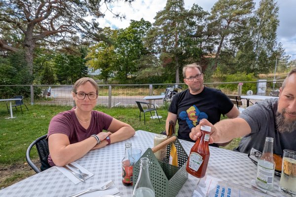 Frisch und gestärkt verpackten wir unsere persönlichen Sachen und machten uns auf den Weg zur grünen Wiese, dem Sammelpunkt unserer Anreise. Von dort aus starteten wir zu unserem letzten gemeinsamen Ausflug: einem 15-minütigen Fußmarsch in den nahegelegenen Ort. Dort in einem kleinen Restaurant bestellten die meisten von uns einen Elch-Burger mit Pommes. Es war ein wahrer Genuss, die Reise bei leckerem Essen und kühlen Getränken in der Sonne ausklingen zu lassen. Maren und ich gönnten uns zum Abschluss noch ein Eis.