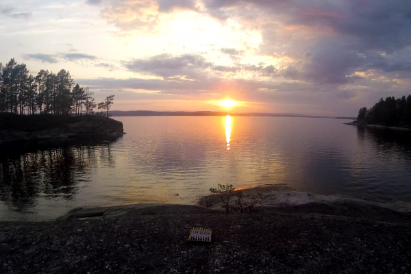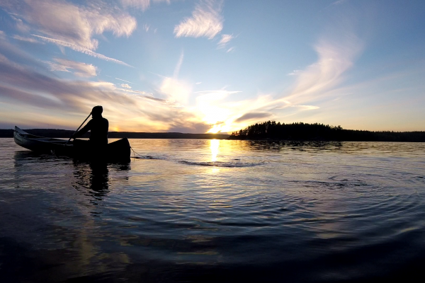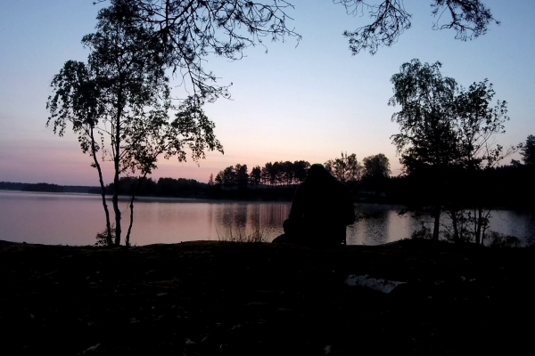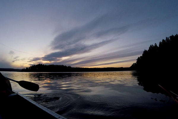 Heute haben wir auf einem Felsen mit herrlichem Blick über dem See unser Zelt aufgeschlagen. Die Sonne spiegelt sich im Wasser, und lässt die Silhouetten der Bäume so unwirklich erscheinen.