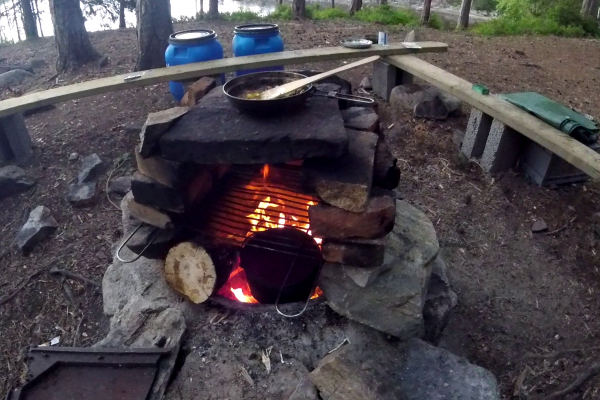 Heute ist es früher am Tag. Nachmittag schätze ich. Gestern war es stressig. Nach dem ewig langen Tag im Boot, waren wir froh das die Shelter nett waren, und Ihr Feuer gern mit uns geteilt haben. Unser Zelt stand weiter unten auf der Insel. Ein Shelter sind in meinem Wortgebrauch 2 Dinge: Eine zu einer Seite offene Holzbaute, mit angrenzender Lagerstelle, wie auch der Bewohner dieser Holzbaute. Beides nenne Ich Shelter. Heute haben wir einen Tag Pause gemacht, bzw. sind nur vom Zelt ins Shelter umgezogen. Nur wenn der Rauch reinzieht, ist es echt blöd! Helge schnitzt mal wieder. Es ist Nachmittags. Es ist Nachmittags, und wir haben den bis jetzt entspanntesten Tag. Heute morgen gab es mit Käse überbackene Stockbrote in der Pfanne. Die waren Gut!! Später am Abend wird es noch Tomatensalat für mich geben, weil die Tomaten weg müssen. Wir überlegen noch, Bratkartoffeln mit Zwiebeln und geröstetem Brot zu machen.