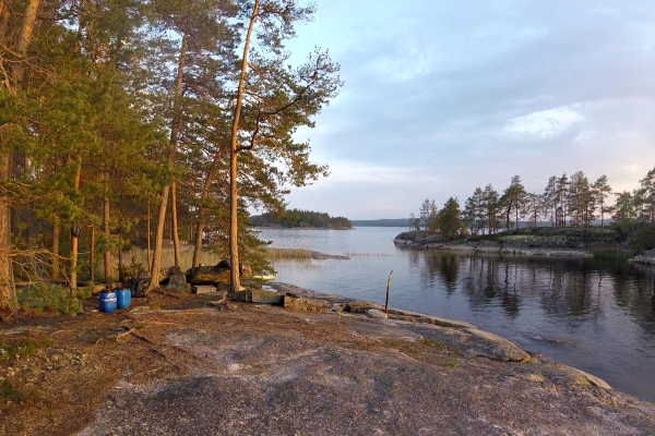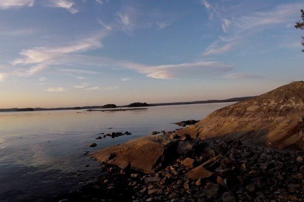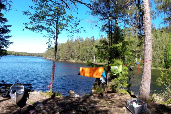 Der zweite Tag ist bald vorbei. Ich sitze auf einem Felsvorsprung in der Abendsonne. Mit 275 Grad Sicht aufs Meer. Hinter mir ist das Lager. Unser Lager besteht immer aus dem Lagerfeuer, bei dem wir eigentlich alle Zeit verbringen. Einem schräg gehängtem Tarp zum Regenschutz für unser Material, dem Anlegeplatz mit Kanu und Kanuwagen, und einer Windschutzplane die zwischen Bäumen passend aufgehängt wird. Und natürlich dem Zelt!