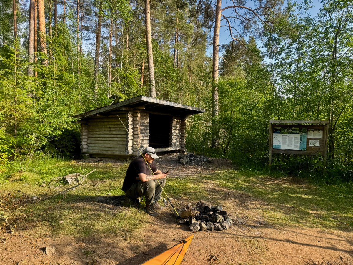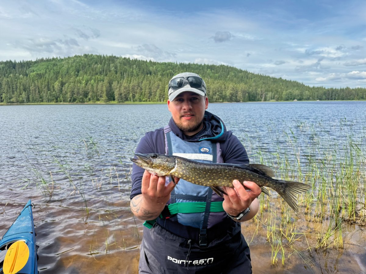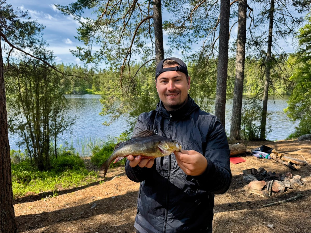 Die ersten Tage waren geprägt vom Einfinden. Wir mussten lernen, wie wir das Kajak beladen, wie wir das Lager aufbauen, wie wir den Alltag draußen organisieren. Am Anfang war das Kajakfahren noch ungewohnt, vom Boot aus zu angeln haben wir uns erst nicht getraut. Das änderte sich mit der Zeit. Das Angeln war für mich eine neue Erfahrung. Wir hatten uns den schwedischen Angelschein besorgt. Ich fand es erstaunlich entspannend. Ich habe die Angel ausgeworfen und die Fische herangezogen, David hat den Rest übernommen. Gefangen haben wir Barsche und Hechte. Der größte Hecht war etwa siebzig Zentimeter lang, der größte Barsch war bei etwa 35 cm. Über dem Lagerfeuer zubereitet schmeckten sie besonders gut.