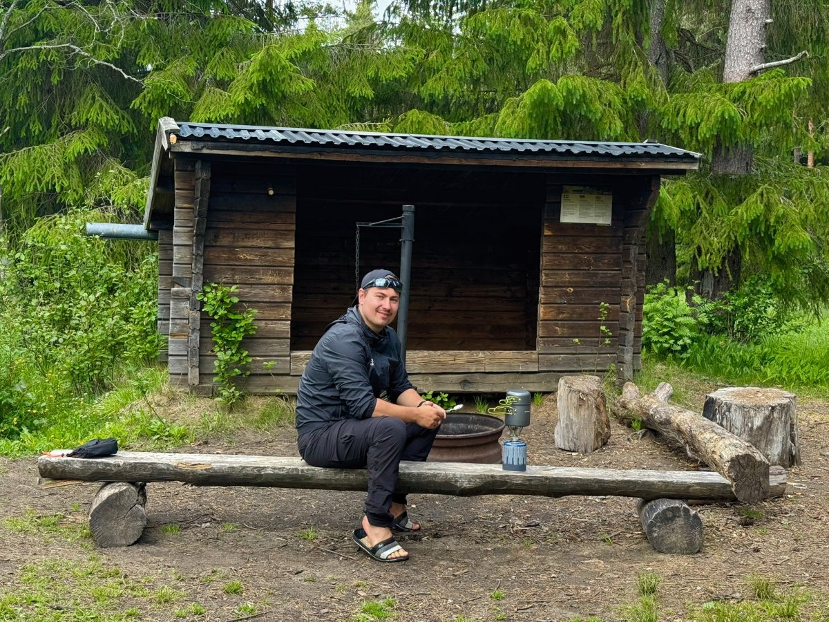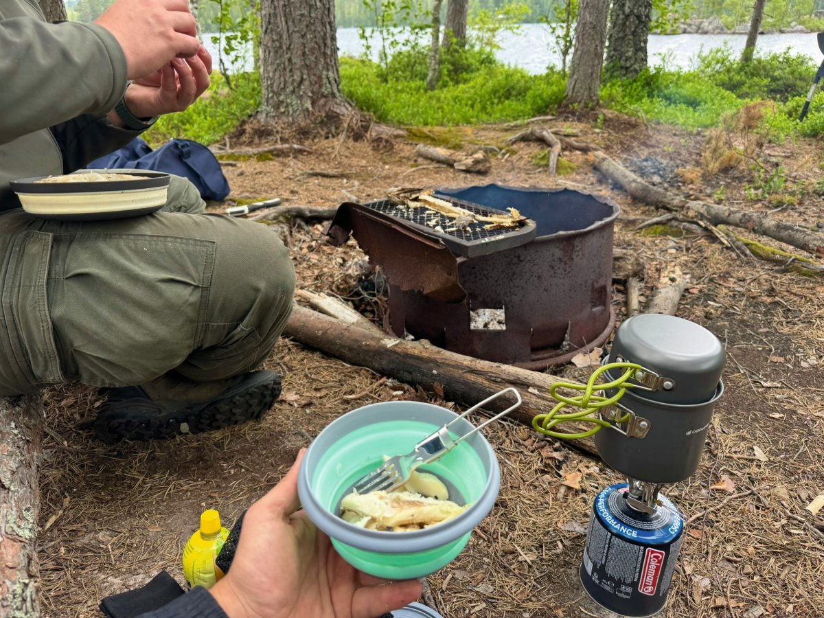 Die Nächte waren oft kalt, trotz guter Schlafsäcke. Wenn der Wind drehte oder das Tarp nicht perfekt gespannt war, zog es ordentlich. Ab dem dritten Tag wurden die Mücken ein echtes Problem. Vor allem die kleinen Sandmücken haben uns zugesetzt. Wir haben versucht, mit langer Kleidung, Mückenspray und Lagerfeuer gegenzuhalten. Es hat geholfen, aber es war anstrengend. Der Schlauchschal war wirklich Gold wert. Unser Essen war einfach, meist Reis mit Tomatenmark, dazu manchmal eine Karotte oder den frisch gefangenen Fisch. Nach dem Verlust unseres Wasseraufbereitungsmittels mussten wir das Wasser abkochen. Tee war dann unsere Rettung. Aber auch so haben wir manchmal einfach das kühle Wasser des Svartälven getrunken und siehe da, uns ist nichts passiert. Wir haben Biberspuren gesehen, frische Elch-Losung entdeckt und unzählige Vögel gehört. Besonders beeindruckend war, wie wenig man eigentlich braucht, um draußen zurechtzukommen, wenn man sich darauf einlässt.
