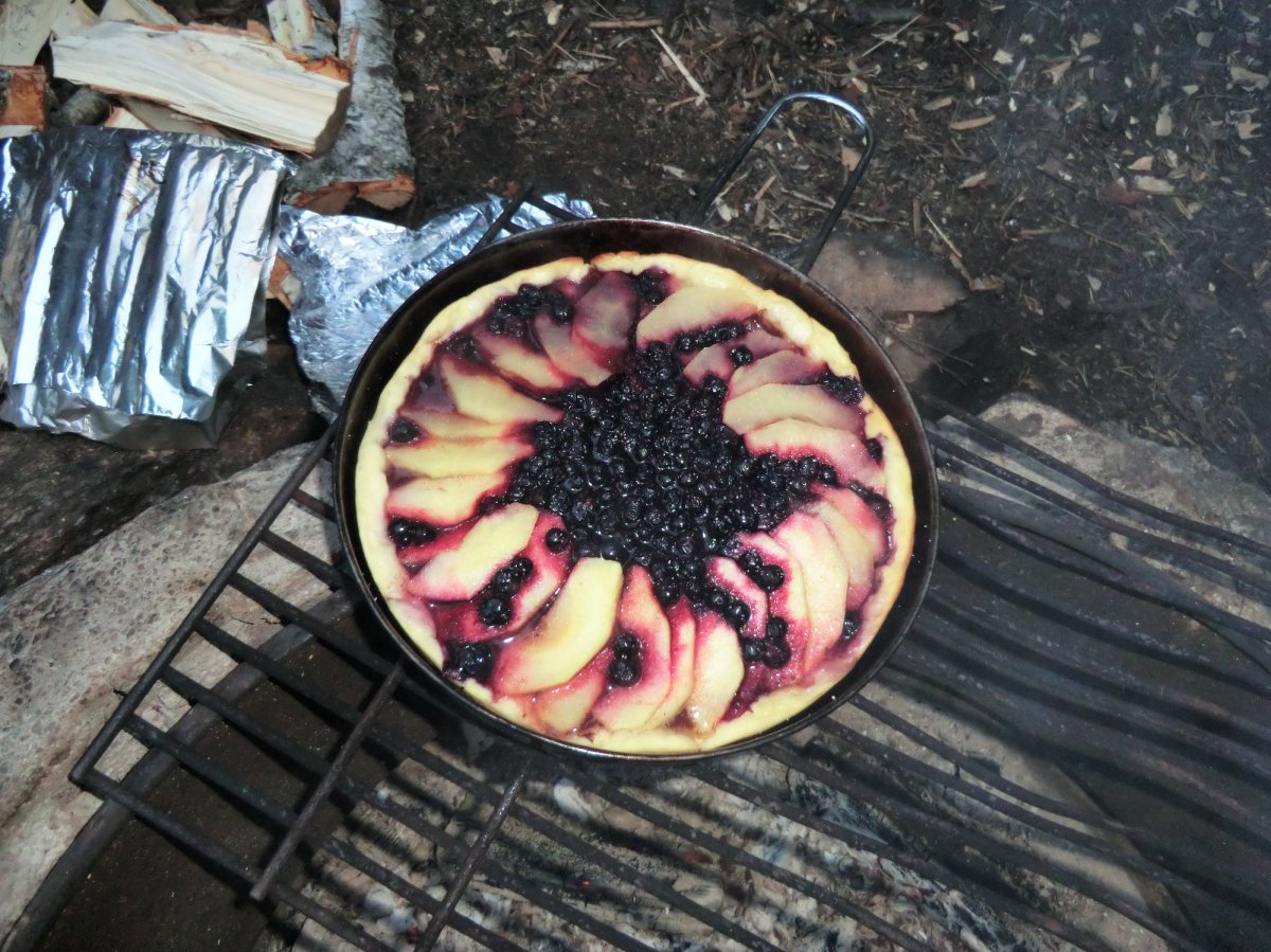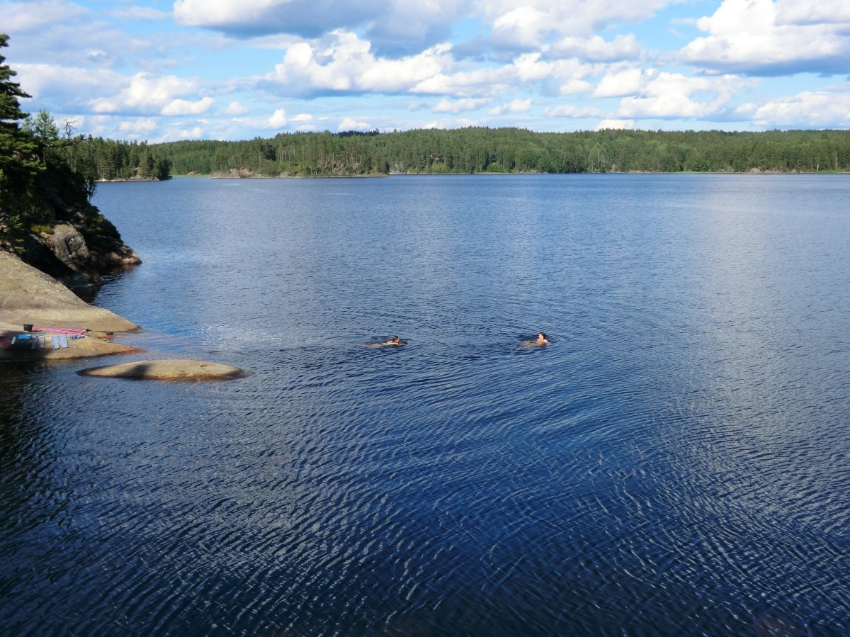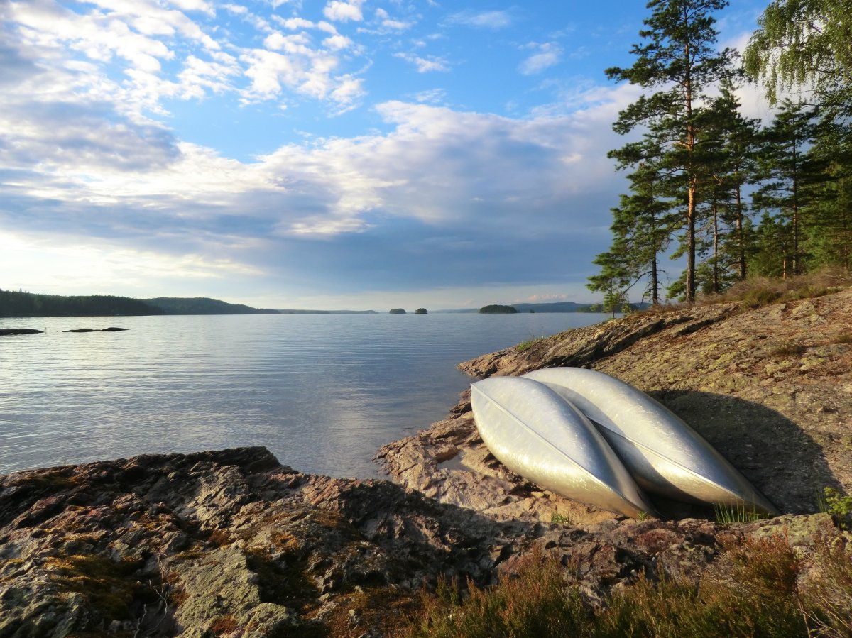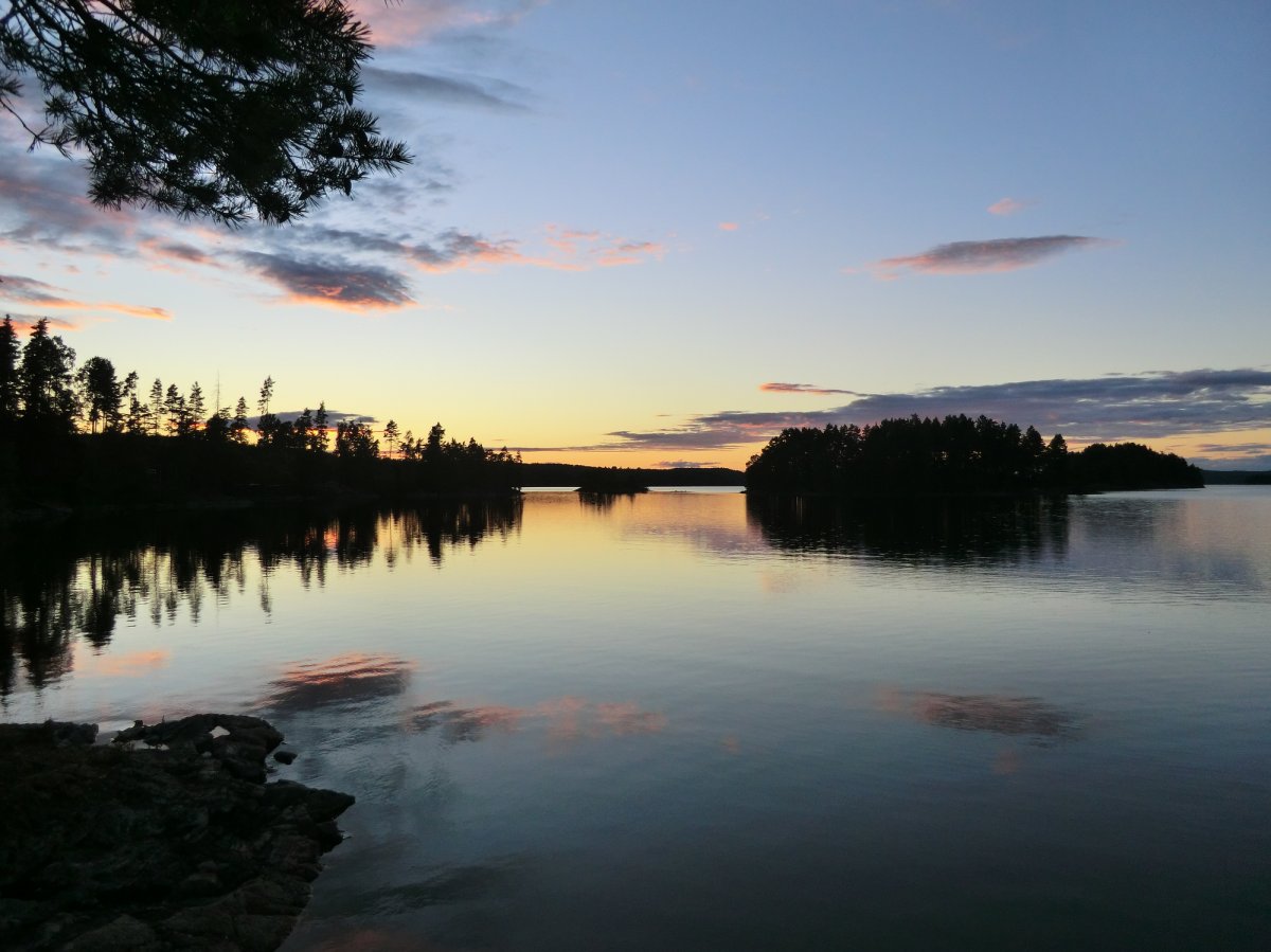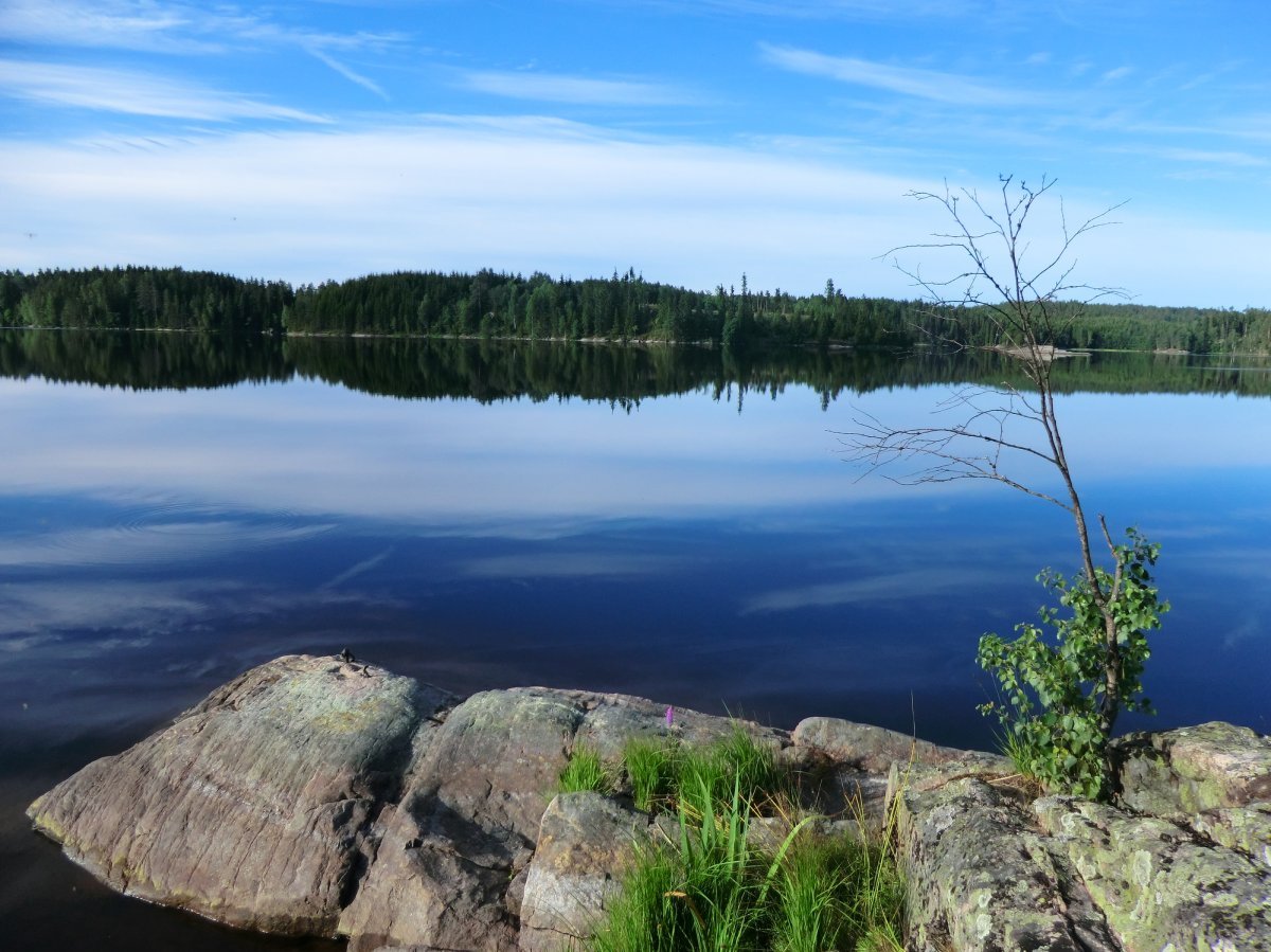 Tag 2 bis 8: Endlich in Höglund angekommen, gabs erstmal etwas zu essen, dann packten wir schnell unsere Sachen, sortierten unsere Ausrüstung, schleppten alles bis zum Wasser, beluden das Kanu und als wir endlich aufs Wasser konnten, zeigte sich die Sonne. So sollte es (fast) die ganze Woche bleiben. Eine Woche Kanufahren, in der Hängematte liegen, Lagerfeuer machen, angeln und im See baden. Ein Traum. Achja und essen. Das Angeln war leider nicht so erfolgreich, aber zum Glück kann man mit dem Outdoor-Verpflegungspaket, aber auch mit den tausenden von Waldbeeren, die man überall findet, feine Sachen zaubern. So gab’s fast täglich Waldbeerpfannekuchen oder Himmbeerkuchen und andere Leckereien mit Sachen aus dem Verpflegungspaket: z.B. Pizza, die Terence-Hill-Pfanne, Bratkartoffeln, Nudeln mit Käse- oder Tomatensauce, Stockbrot und vieles mehr. Sowieso schmeckt alles, was man in der Wildnis über einem Lagerfeuer direkt doppelt so gut. Dieses Jahr gab es sogar mehrere Tage Tomaten-Gurken-Salat. Bei unserer ersten Reise vor zwei Jahren hat das Gemüse leider den Transport in der Tonne nicht überlebt. So langsam werden wir noch Outdoor-Kochprofis. Auch beim Auf- und Abbauen unserer Lager wurden wir täglich schneller. Meistens steuerten wir dafür Inseln an, jede ein bisschen anders. Von Sandstrand bis zu hohen Felsen ist alles dabei. Aber hin und wieder legten wir auch am Festland an.