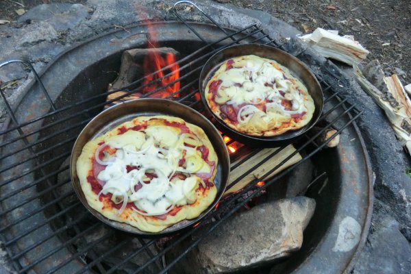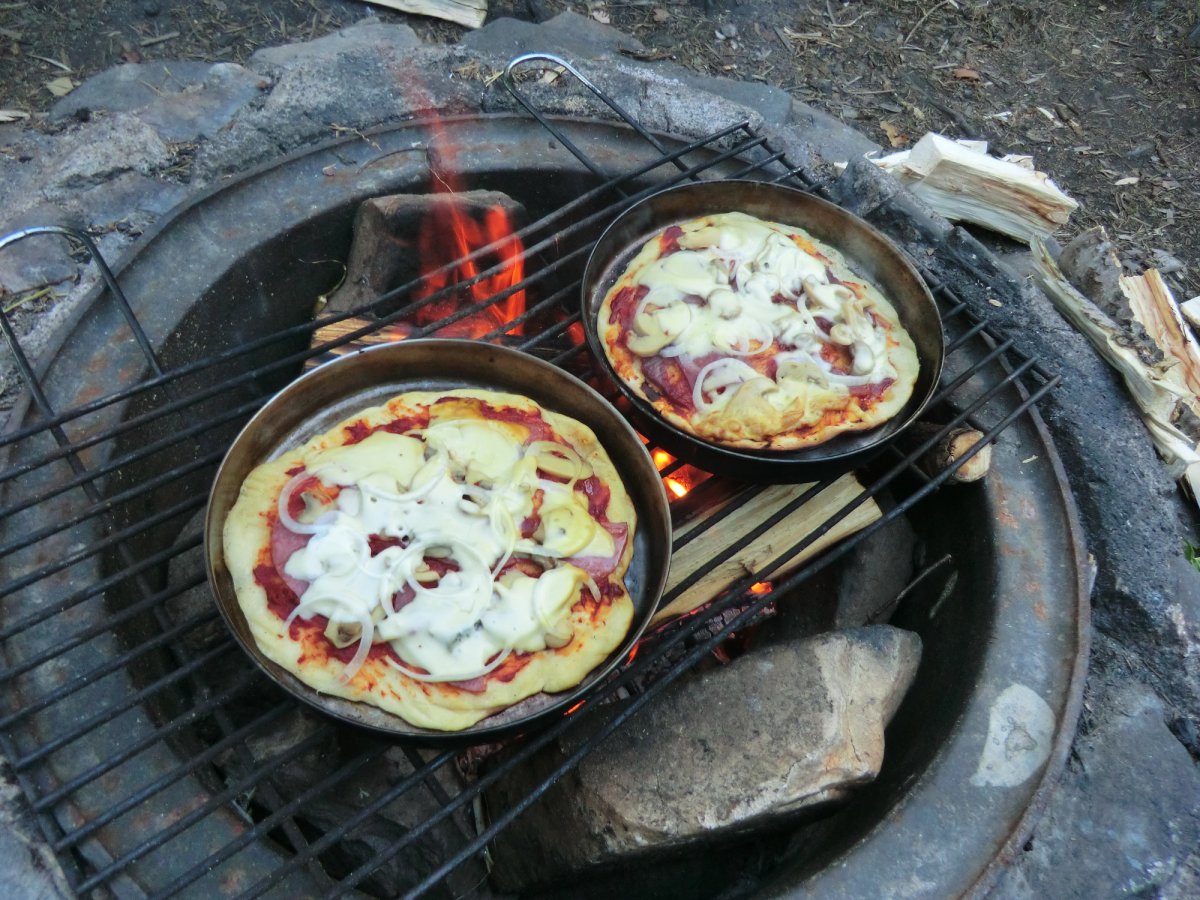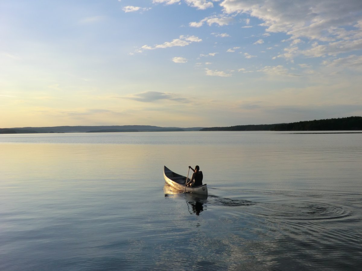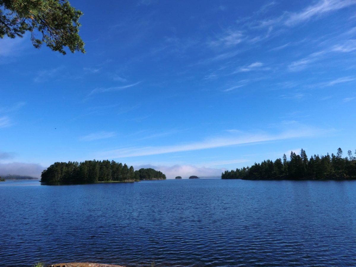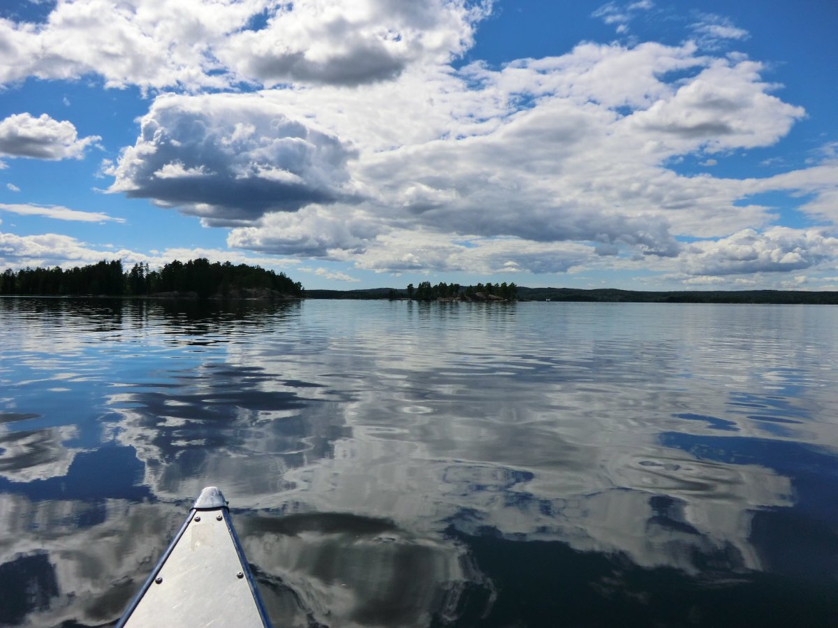 Tag 2 bis 8: Endlich in Höglund angekommen, gabs erstmal etwas zu essen, dann packten wir schnell unsere Sachen, sortierten unsere Ausrüstung, schleppten alles bis zum Wasser, beluden das Kanu und als wir endlich aufs Wasser konnten, zeigte sich die Sonne. So sollte es (fast) die ganze Woche bleiben. Eine Woche Kanufahren, in der Hängematte liegen, Lagerfeuer machen, angeln und im See baden. Ein Traum. Achja und essen. Das Angeln war leider nicht so erfolgreich, aber zum Glück kann man mit dem Outdoor-Verpflegungspaket, aber auch mit den tausenden von Waldbeeren, die man überall findet, feine Sachen zaubern. So gab’s fast täglich Waldbeerpfannekuchen oder Himmbeerkuchen und andere Leckereien mit Sachen aus dem Verpflegungspaket: z.B. Pizza, die Terence-Hill-Pfanne, Bratkartoffeln, Nudeln mit Käse- oder Tomatensauce, Stockbrot und vieles mehr. Sowieso schmeckt alles, was man in der Wildnis über einem Lagerfeuer direkt doppelt so gut. Dieses Jahr gab es sogar mehrere Tage Tomaten-Gurken-Salat. Bei unserer ersten Reise vor zwei Jahren hat das Gemüse leider den Transport in der Tonne nicht überlebt. So langsam werden wir noch Outdoor-Kochprofis. Auch beim Auf- und Abbauen unserer Lager wurden wir täglich schneller. Meistens steuerten wir dafür Inseln an, jede ein bisschen anders. Von Sandstrand bis zu hohen Felsen ist alles dabei. Aber hin und wieder legten wir auch am Festland an.