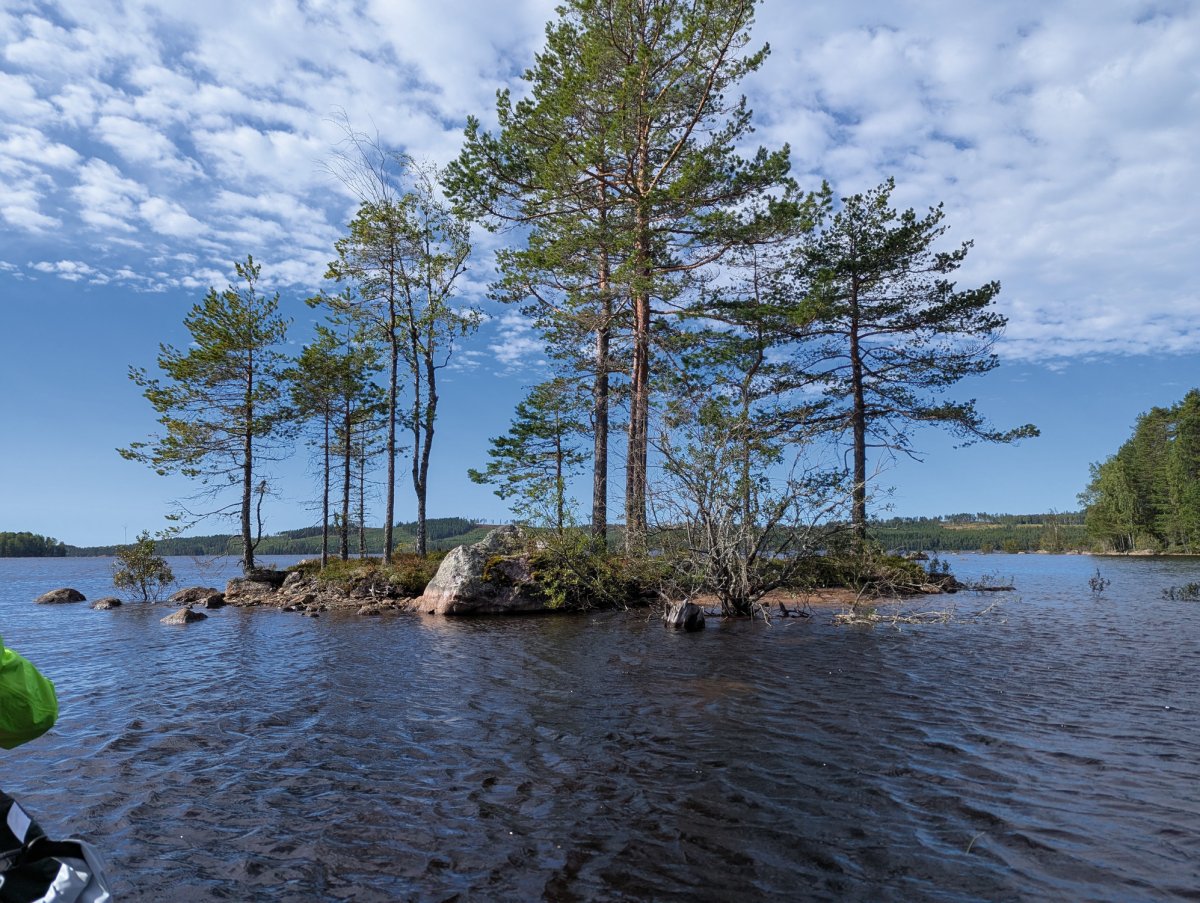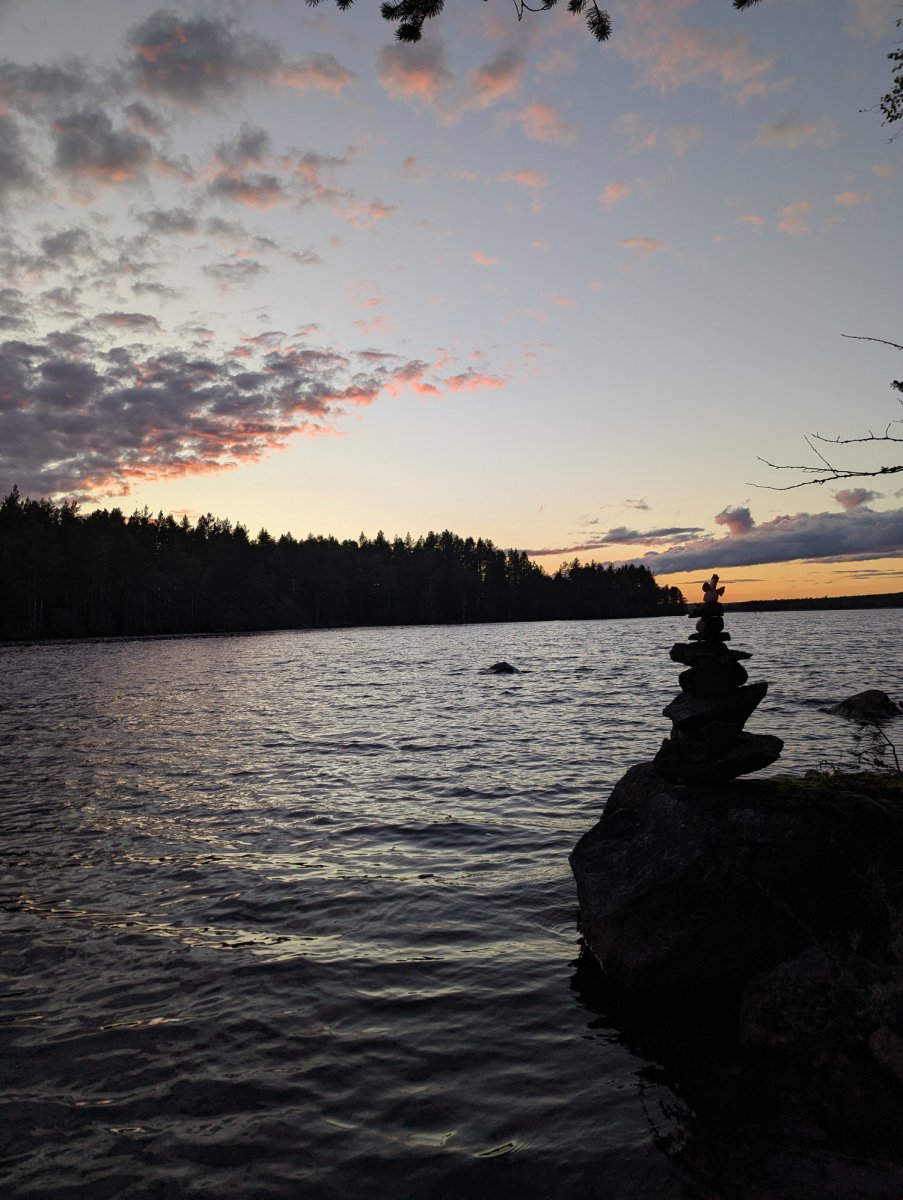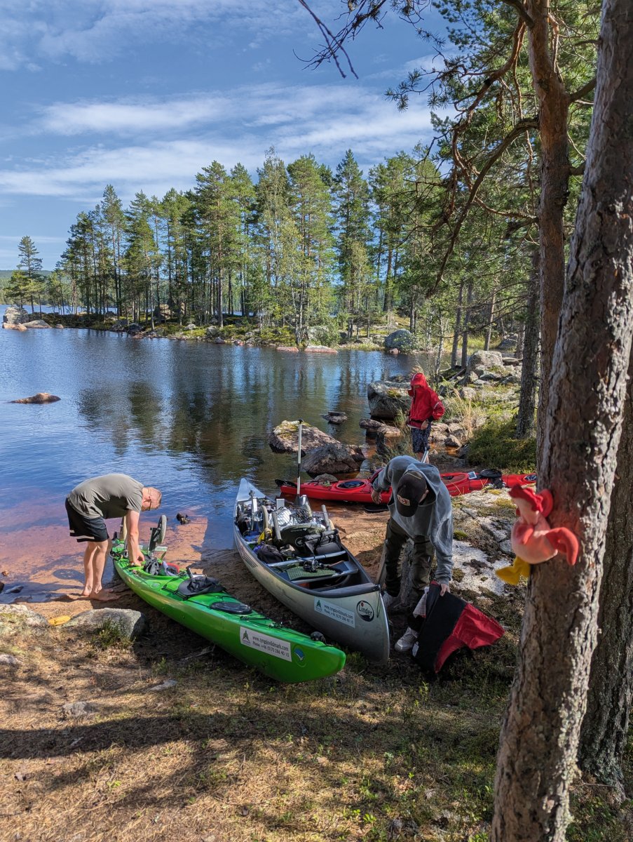 Das Wetter der drei Tage war angenehm, von heiter bis wolkig über leichte Wolken bis hin zu Sonnenstrahlen. Nach der ersten Nacht in der Natur darf ein leckeres Frühstück am kleinen Lagerfeuer natürlich nicht fehlen. Direkt im Anschluss sprangen drei von uns ins Wasser und wärmten sich danach an der Restwärme des Feuers. Der Kanadier ließ sich durch bessere Gewichtsverteilung viel besser steuern und wir sind einmal gerade aus rüber auf eine Insel zu gefahren. Hier haben wir einen geeigneten Platz für die Nacht gefunden. Nach einer halben Stunde erfolglosem angeln sind wir dann doch aufgebrochen um einmal die Insel zu umrunden, um vielleicht auf der anderen Seite einen besseren Schlafplatz zu finden. Auf der Rückseite haben wir andere Reisende gesehen, sind an Ihnen vorbei gefahren um wieder zu dem vorher gesehenen Rastplatz zu gelangen. Zwischen den Inseln war moorig-strauchiges Sumpfgebiet, der schwere Kanadier ist ohne aufzulaufen durchgekommen. Die späte Rückkehr am Rastplatz hat dazu geführt, dass wir unser Sonntagsessen, Rouladen mit Rotkohl und Kartoffeln erst spät im dunklen essen konnten. Der nächste Tag startet mit einem leckeren Frühstück. Zwei von uns starteten eine kleine Exkursion in die Nebenbucht über große Felsen und viel Totholz. Die anderen beiden räumten auf und bereiteten sich auf das Baden vor. Als die kurze Exkursion vorbei war, sind die beiden mit ins Wasser gegangen, einer von uns hat geschnorchelt und viel Unterwasser entdeckt. Am frühen Nachmittag sind wir wieder in See gestochen, bei einer wohlverdienten Pause konnten wir viele Blaubeeren pflücken. Nach der Pause haben wir die Fahrt Richtung Süden gegen den Wind vorgesetzt. Erst spät fanden wir einen geeigneten Übernachtungsplatz mit relativ wenig Windzug. Erst als das Lager aufgebaut war haben wir an der Spitze der Bucht eine kleine Feuerstelle entdeckt. Wir fanden ein Dreibein, welches direkt beim kochen genutzt werden konnte. Heute war alles etwas später also ging es nach dem essen und kurzen nette Gesprächen ins Bett. Der Nächste Tag begann wie der davor, entspannt am Lagerfeuer frühstücken und die Sonne genießen. Drei von uns gingen Baden, einer rollte sogar ein paar Mal mit dem Kajak, ein anderer übte sich zeitgleich im Klippenspringen, mit Salto. Ebenso wurde erneut erfolglos geangelt. Neben unserem Rastplatz war ein älterer Rastplatz, hier wurde leider sehr viel Natur zerstört und Bäume grob umgeaxtet, sehr schade. Wir haben noch einige Reste von dort verwerten können, zb. das Dreibein für die Feuerstelle. Aufbruch: Ziel war es zur ersten Umtrage zu gelangen. Der See war fast Wellenlos und es gab wenig Wind, wir sind durch ein paar kleine Buchten gefahren, um kleine Inseln und haben auf dem Weg einen netten Rastplatz gefunden. Sind aber weitergefahren. Der Rastplatz an der Umtrage war leider nicht schön und ungeeignet. Da ein weiterer möglicher Rastplatz in der Nähe immer noch belegt war (seit Tag 1) sind wir zurück zu dem auf dem Weg gefundenen Rastplatz, da es schon spät und eine weitere Suche erfolglos war. Die Feuerstelle war ein kleiner Steinofen, selbstgebaut von vorher hier campierenden, Andreas fing sofort mit dem Kochen an, da sein SchlafSetUp immer am schnellsten aufgebaut war, es gab ChilliConCarne mit Bohnen. Auf mysteriöse und unerklärliche Weise gelang eine gute Portion bester Pudersand in die Pfanne. Das knirscht zwischen den Zähnen.