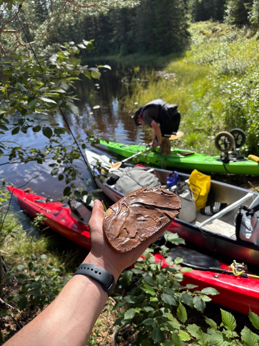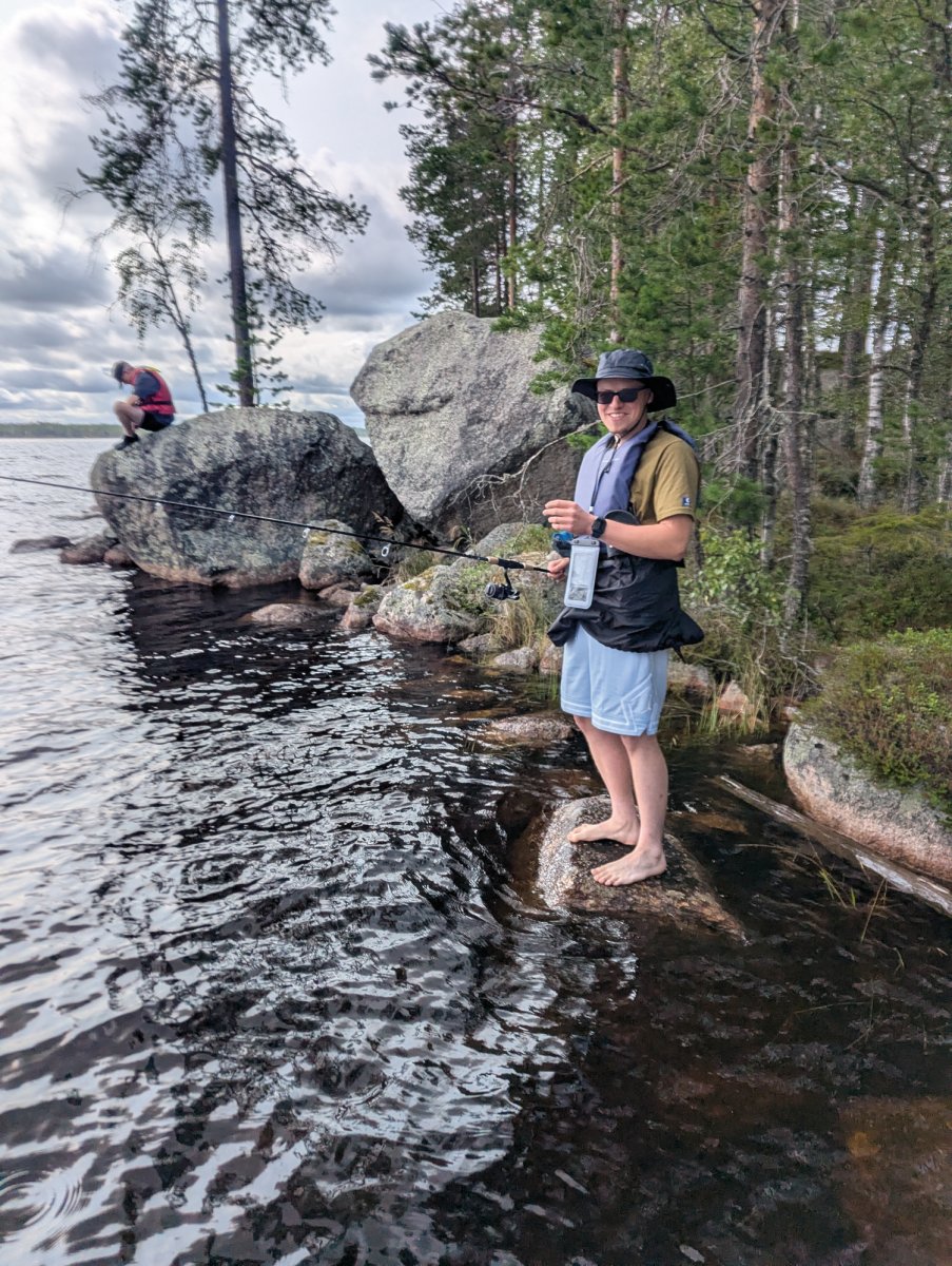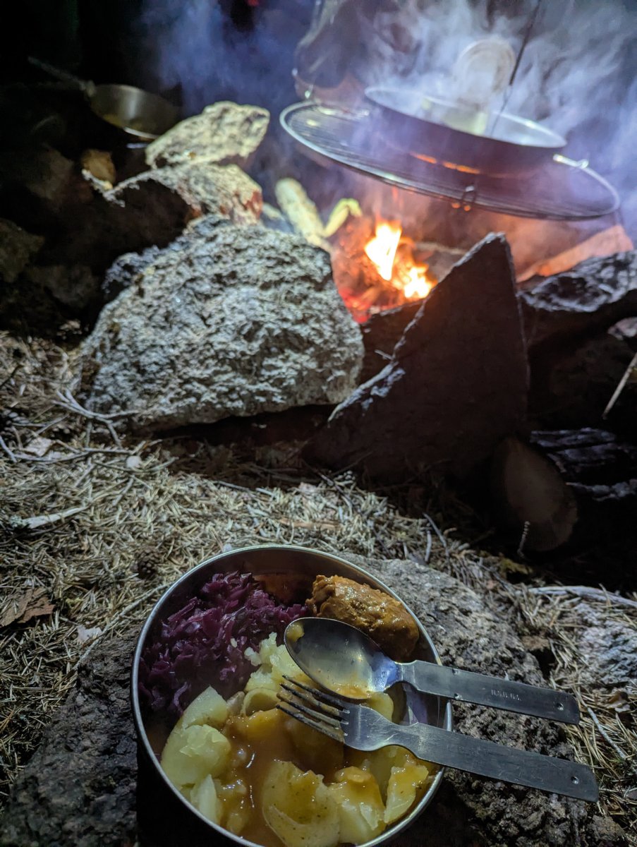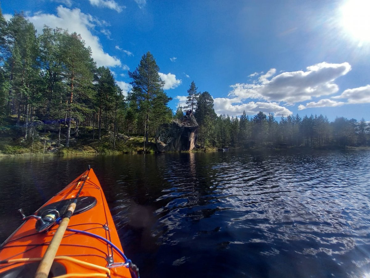 Das Wetter der drei Tage war angenehm, von heiter bis wolkig über leichte Wolken bis hin zu Sonnenstrahlen. Nach der ersten Nacht in der Natur darf ein leckeres Frühstück am kleinen Lagerfeuer natürlich nicht fehlen. Direkt im Anschluss sprangen drei von uns ins Wasser und wärmten sich danach an der Restwärme des Feuers. Der Kanadier ließ sich durch bessere Gewichtsverteilung viel besser steuern und wir sind einmal gerade aus rüber auf eine Insel zu gefahren. Hier haben wir einen geeigneten Platz für die Nacht gefunden. Nach einer halben Stunde erfolglosem angeln sind wir dann doch aufgebrochen um einmal die Insel zu umrunden, um vielleicht auf der anderen Seite einen besseren Schlafplatz zu finden. Auf der Rückseite haben wir andere Reisende gesehen, sind an Ihnen vorbei gefahren um wieder zu dem vorher gesehenen Rastplatz zu gelangen. Zwischen den Inseln war moorig-strauchiges Sumpfgebiet, der schwere Kanadier ist ohne aufzulaufen durchgekommen. Die späte Rückkehr am Rastplatz hat dazu geführt, dass wir unser Sonntagsessen, Rouladen mit Rotkohl und Kartoffeln erst spät im dunklen essen konnten. Der nächste Tag startet mit einem leckeren Frühstück. Zwei von uns starteten eine kleine Exkursion in die Nebenbucht über große Felsen und viel Totholz. Die anderen beiden räumten auf und bereiteten sich auf das Baden vor. Als die kurze Exkursion vorbei war, sind die beiden mit ins Wasser gegangen, einer von uns hat geschnorchelt und viel Unterwasser entdeckt. Am frühen Nachmittag sind wir wieder in See gestochen, bei einer wohlverdienten Pause konnten wir viele Blaubeeren pflücken. Nach der Pause haben wir die Fahrt Richtung Süden gegen den Wind vorgesetzt. Erst spät fanden wir einen geeigneten Übernachtungsplatz mit relativ wenig Windzug. Erst als das Lager aufgebaut war haben wir an der Spitze der Bucht eine kleine Feuerstelle entdeckt. Wir fanden ein Dreibein, welches direkt beim kochen genutzt werden konnte. Heute war alles etwas später also ging es nach dem essen und kurzen nette Gesprächen ins Bett. Der Nächste Tag begann wie der davor, entspannt am Lagerfeuer frühstücken und die Sonne genießen. Drei von uns gingen Baden, einer rollte sogar ein paar Mal mit dem Kajak, ein anderer übte sich zeitgleich im Klippenspringen, mit Salto. Ebenso wurde erneut erfolglos geangelt. Neben unserem Rastplatz war ein älterer Rastplatz, hier wurde leider sehr viel Natur zerstört und Bäume grob umgeaxtet, sehr schade. Wir haben noch einige Reste von dort verwerten können, zb. das Dreibein für die Feuerstelle. Aufbruch: Ziel war es zur ersten Umtrage zu gelangen. Der See war fast Wellenlos und es gab wenig Wind, wir sind durch ein paar kleine Buchten gefahren, um kleine Inseln und haben auf dem Weg einen netten Rastplatz gefunden. Sind aber weitergefahren. Der Rastplatz an der Umtrage war leider nicht schön und ungeeignet. Da ein weiterer möglicher Rastplatz in der Nähe immer noch belegt war (seit Tag 1) sind wir zurück zu dem auf dem Weg gefundenen Rastplatz, da es schon spät und eine weitere Suche erfolglos war. Die Feuerstelle war ein kleiner Steinofen, selbstgebaut von vorher hier campierenden, Andreas fing sofort mit dem Kochen an, da sein SchlafSetUp immer am schnellsten aufgebaut war, es gab ChilliConCarne mit Bohnen. Auf mysteriöse und unerklärliche Weise gelang eine gute Portion bester Pudersand in die Pfanne. Das knirscht zwischen den Zähnen.