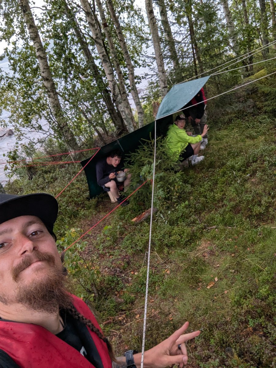 Nach der regnerischen Nacht haben wir uns morgens Pfannkuchen gebacken, das hebt die Laune. Danach ging es auch schon los auf den See, an dem ersten ausgesuchten Lagerplatz waren leider schon andere Kajak-Urlauber, also mussten wir die Suche fortsetzten. Also sind wir um diese Insel gefahren, haben einen netten Rastplatz gesehen, sind aber weiter zur morgigen Abholstelle um zu sehen was uns dort erwartet. Nach kurzer Besichtigung der Abholstelle und Lagecheck kamen Gewitterwolken auf uns zu. Wir haben schnell einen provisorischen Schutz gegen das Gewitter gebaut und abgewartet, zwischendurch gab es Suppe auf dem Gaskocher. Nach dem Gewitter sind wir wieder los und haben einen geeigneten Schlafplatz gesucht, leider nichts Gescheites gefunden, also zu dem am Vormittag schon gesehenen Platz gefahren. Das Feuer hat lange auf sich warten lassen, da alles sehr nass war. Zwei von uns haben auf der winzigen Insel nebenan geschlafen, die anderen beiden am Feuer. Es gab einen sehr schönen Sonnenuntergang.