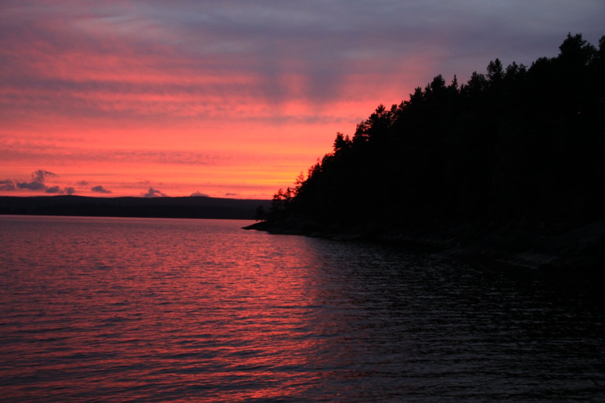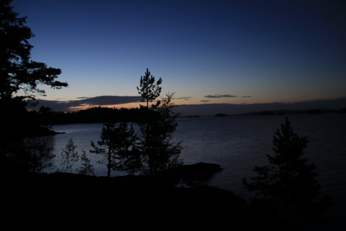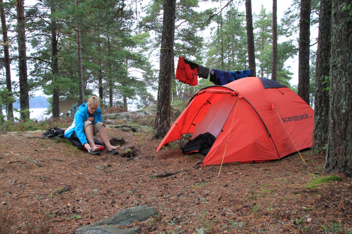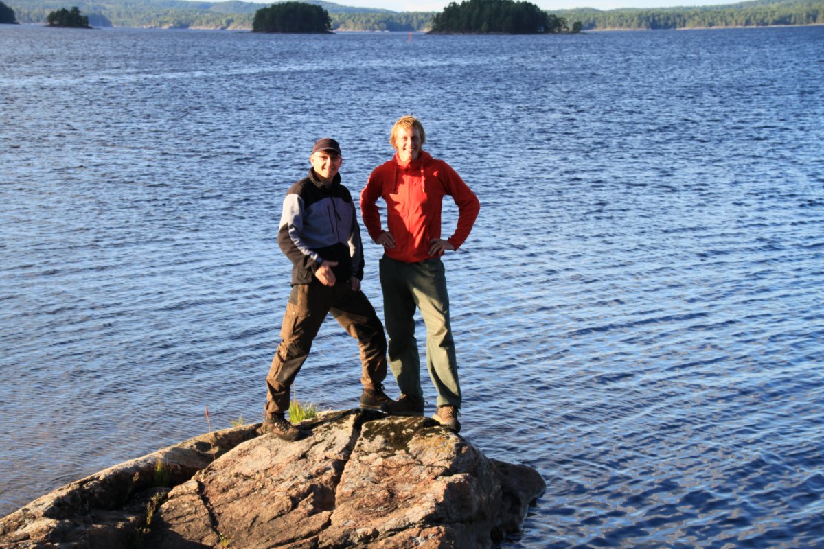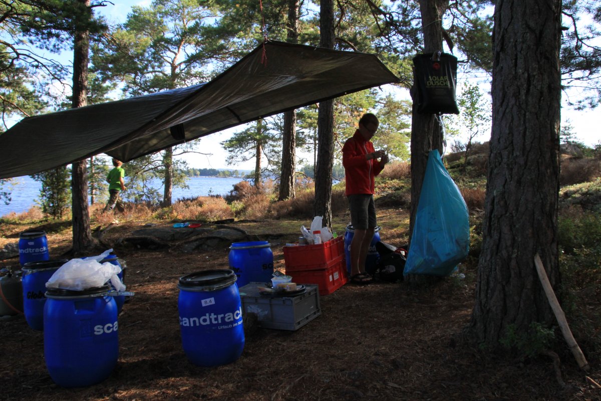 Angekommen, spätestens nach der Frage: „Wo ist Lars?“ Das Ufer ist sehr schön felsig und mit Kiefern bewaldet. Hier und da sandige Strände. Nach gut 2,5 Stunden kommt die beschriebene Insel in Sicht. Ich schaue mir die Karte noch einmal an und bin mir sicher, es handelt sich um die Insel Bärön. Rastplatz Nummer 19. Erstmal schauen was in den Tonnen ist: Brot, Salami und Margarine – das reicht für einen kleinen Imbiss. Der Schlafplatz wird traumhaft auf den Felsen ausgewählt, unweit der Hütte. Nachdem das Material hoch geschafft und die Zelte aufgebaut sind, kommt auch die andere Gruppe an. Das Wetter lädt zum Baden ein. Die Felsplatten sind angenehm warm und mir gefällt der sandfreie Badezugang. Wolken verdunkeln den Himmel, dies verkürzt den Badespaß. Nachdem ich das Wasser aus einiger Uferentfernung geholt habe, bemerke ich durch den Sucher meiner Fotokamera einen Ölteppich, auf unserem Trinkwassersee – keine gute Visitenkarte.