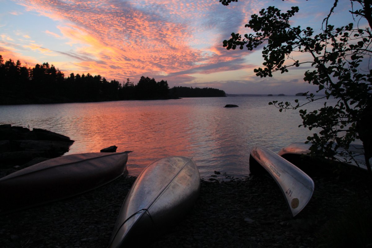 Der Morgen ist trocken, aber die Sonne fern – verdeckt durch eine dichte Wolkendecke. Wir hoffen, wenigstens trocken, unser Lager auflösen zu können. Und die Sonne erkämpft sich immer mehr den Himmel. Als wir die Kanus beladen, hat sie gewonnen und der Tag verheißt herrlich zu werden. Der See ist durch den Wind leicht aufgeraut und wir schneiden die Wellen, mit leichtem Rückenwind. Nach einer Stunde machen wir eine kleine Pause und Rasten am Ufer einer Insel.