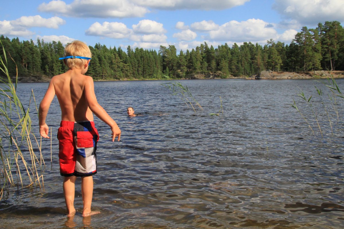Wir starten mit den vollgepackten Kanus bei viel Sonne und leichtem Wind. Nach knapp zwei Stunden erreichen wir unser Tagesziel. Sehr schöne Insel, mit einem kleinem Sandstrand. Nachdem das Lager eingerichtet ist, hält uns nichts mehr an Land. Das Schwimmen in dem herrlich klaren und warmen Wasser ist traumhaft. Die Sonne trocknet uns beim Relaxen. Gut erholt starten wir mit dem unbeladenen Kanu und ohne Kinder zu einer kleinen Erkundungstour. Wir kreuzen über offenes Wasser und zerschneiden die kleinen Wellen mit dem Bug. Plötzlich sind die „Dinger“ richtig schnell, wenn beide Paddeln und nicht nur einer … Wir sehen eine Biberburg an der Uferböschung, aber der Biber macht sich rar. Der Wind wird stärker und der Rückweg wird noch einmal anstrengend.