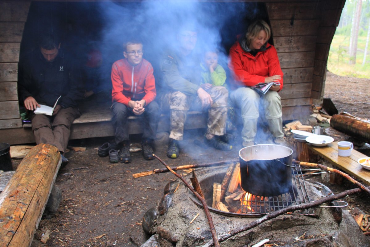Gestern wurde das Feuerverbot aufgehoben, modern – per SMS. David schlägt vor, in Anbetracht der hohen Freudenfeuerdichte den Lagerplatz lieber nicht aufzugeben und dann morgen unseren reservierten Platz in Camp-nähe anzusteuern. Demokratisch entscheiden wir uns fürs „bleiben“ - wie sich später herausstellen sollte, die absolut richtige Entscheidung. Also bekommen wir einen Grundkurs in Holzsägen und -spalten. Das trübe Wetter wächst sich zu einem handfesten Dauerregen aus. Die Kinder lassen sich beim Holzhacken durch das Regenwetter nicht beirren, aber die Erwachsenen bauen die Tarps auf. Der damit gewonnene Trockenraum wird vollends ausgenutzt. Nudeln mit Tomatensoße erhält kurz unsere Laune, aber beim Topf anheben verbrüht sich Marion schlimm an der echten Hand. Auf den Finger bilden sich schnell trotz sofortiger Kühlung Blasen, die den Topfhenkel nach zeichnen. Marion ist tapfer und verzieht keine Mine. Als kleiner Trost gibt es eine frische Tasse Kaffee.