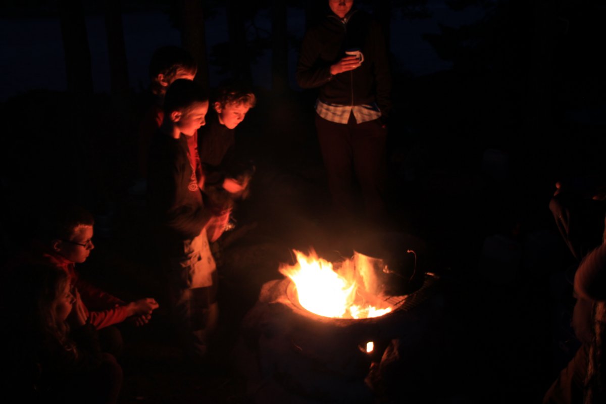 Mika und ich ziehen uns zu einem kurzen Schläfchen zurück. Der Regen wird stetig heftiger – so ein Schei...benkleister! Doch gegen Abend lässt der Regen nach und hört schließlich ganz auf. Das Feuer tut gut und wärmt die nasse Atmosphäre – endlich Feuer. Entfacht wurde natürlich stilecht, mit „Zwergenbart“ und Magnesium-Funken. Auch wenn der Zwergenbart durch ein technisches Produkt ersetzt wurde: der Tampon ist einfach viel zündfreudiger. Den dieser geht ab wie ein Zäpfchen. Unser unter Schweiß vorbereitetes Holz brennt hervorragend und bereitet unser Abendbrot. Zur Resteverwertung backe ich die verbliebenen Nudeln in der Pfanne, zusammen mit Salamistücken. Das Gemeinschaftessen ist heute Bohnen und Speck mit Stockbrot. Das Essen ist ein großes Gemeinschaftserlebnis. Wir sitzen noch lange bis in die Nacht am prasselnden Lagerfeuer und werfen immer wieder trockenes Nadelholz nach. Doch der Sog des warmen Schlafsackes wird immer unwiderstehlicher...