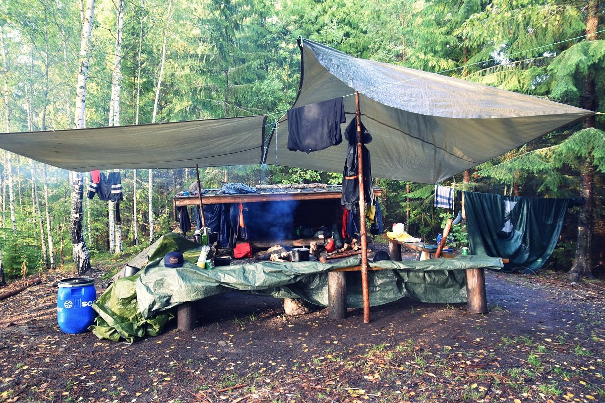 Schon bald sind die Zelte wieder aufgebaut und die Planen hängen über der Feuerstelle. Diese sind auch sehr von Nöten, denn zeitweise gießt es aus Kübeln und ein richtig kleiner Fluss fließt am Ende der Plane herunter.
