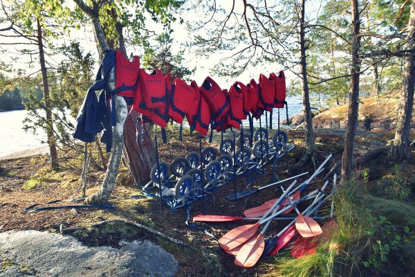 Bei Traumwetter paddelt unsere Truppe also aus der Bucht heraus auf den Foxen. Da ich das erste Mal in Schweden bin und bisher immer nur Fotos gesehen habe, bin ich „geflashed“ von der Landschaft und sitze vor mich hin grinsend in meinem Kanu. Das Grinsen verstärkt sich zunehmend, da wir Kanuneulinge das mit dem richtigen Paddeln und der Steuerung noch nicht ganz raus haben und es so zu munterem Zick-Zack- Kurs Paddeln und einigen kleineren Zusammenstößen kommt. Am frühen Nachmittag kommen wir schließlich an unserem ersten Übernachtungsplatz an. Da wir als größere Gruppe dem An- und Abreisetrubel etwas umgehen wollen, ist dieser Platz kein offizieller Dano- Platz und besteht „nur“ aus einer Feuerstelle mit Bänken drum herum. Dies tut der Idylle aber natürlich keinen Abbruch.