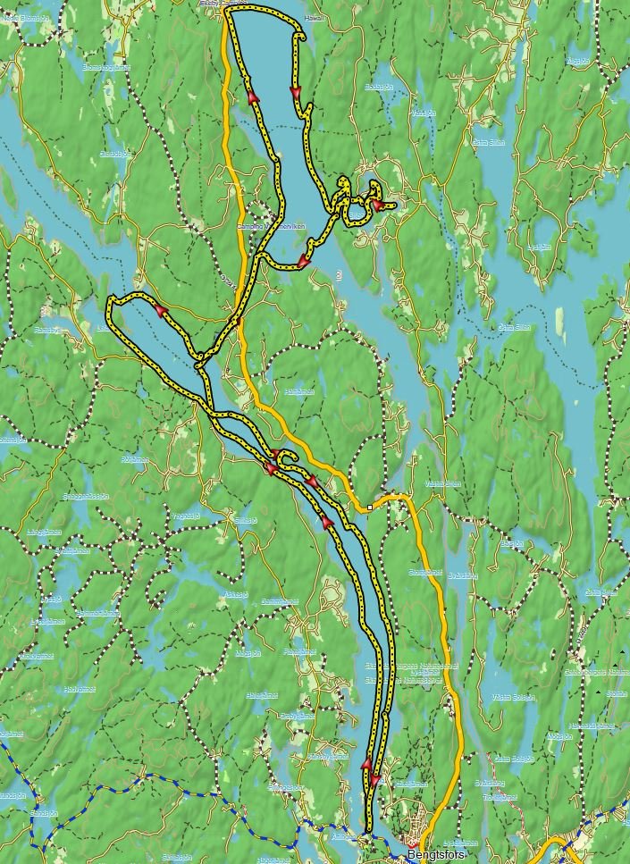 Die Route mag optisch keinem festen Schema folgen, sondern war eher dem Wunsch gefolgt bei Gustavsfors zu schleusen, einige Seitenarme zu befahren und Seequeerungen aufgrund des Windes zu machen.