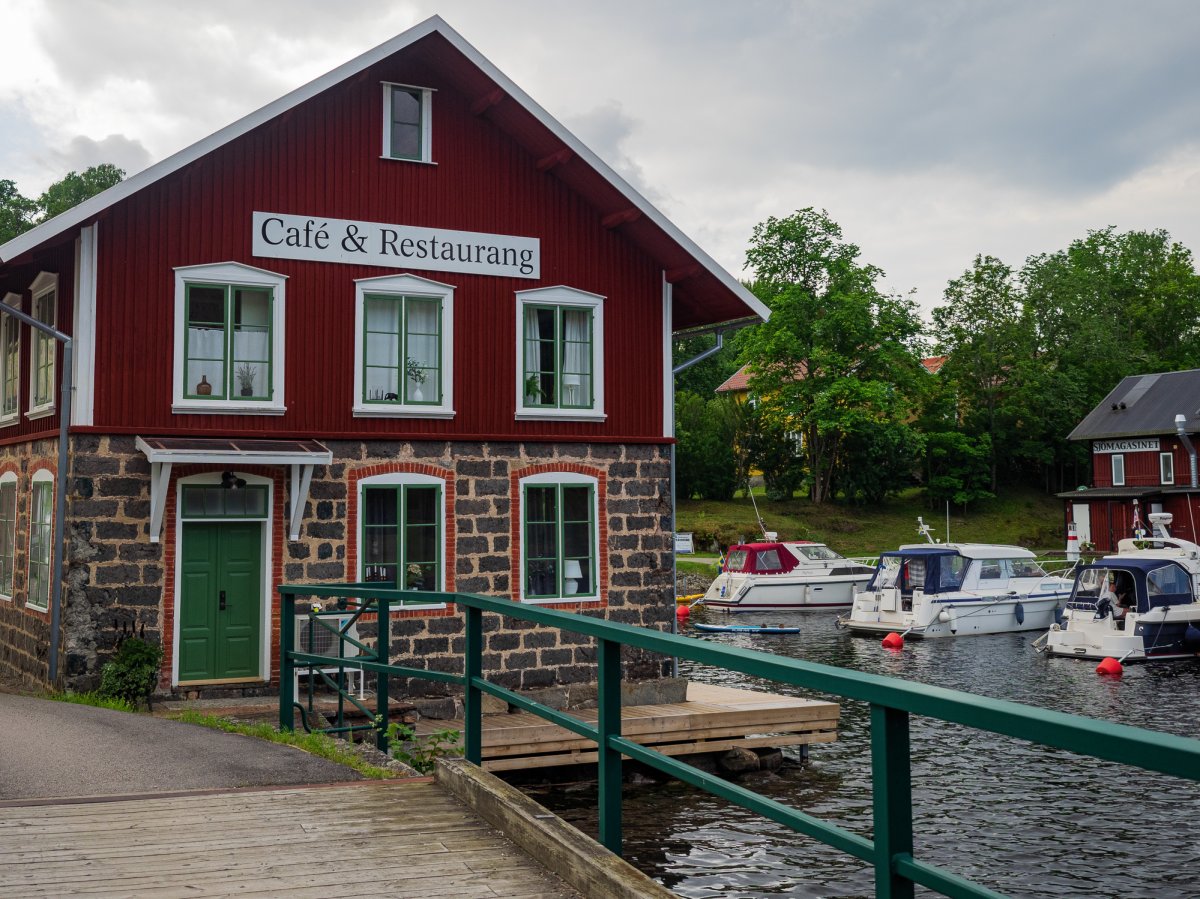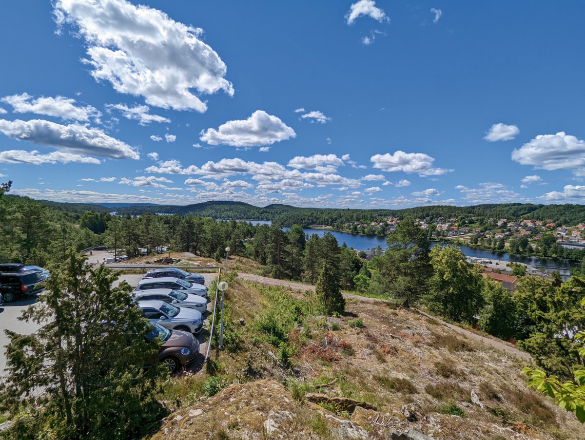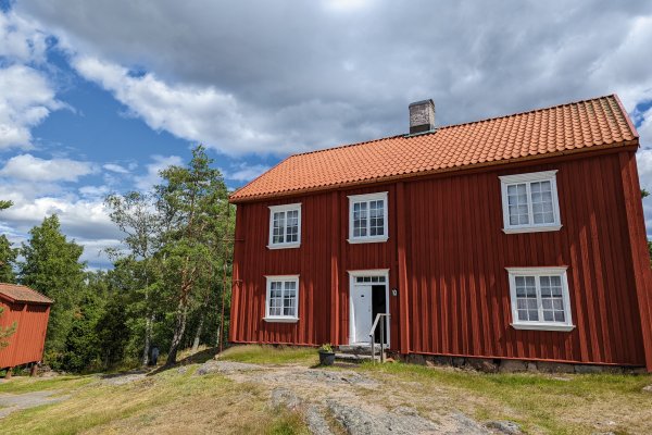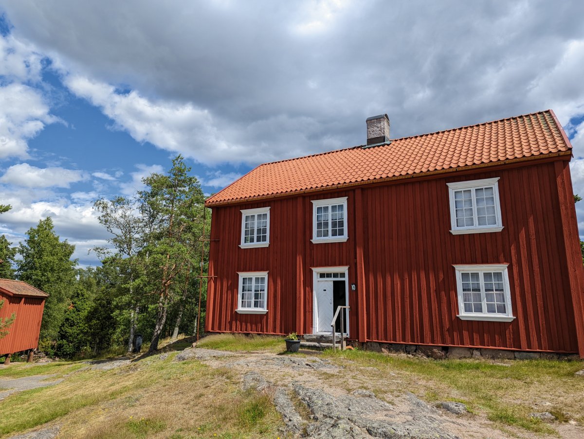 Wir gingen in den EKA Miljörum - Park. Dieser veranschaulicht den schwedischen Umgang mit Altlasten im Boden. Sehr empfehlenswert und gut gemacht. Anschließend kamen wir bei 23 Grad Celsius ins Schwitzen als wir den Majberge bestiegen. Mit wunderschöner Aussicht über Bengtsfors und den Lelång liegt das Gammelgårdens Friluftsmuseum Bengtsfors (siehe Foto 12). Gegen Eintritt kann man sich das schwedische Leben von vor etwa 200 Jahren vor Augen führen. Die Häuser wurden in ihrer Heimat abgebaut und auf den Majberge wieder aufgebaut. Das „große Haus“ hat es mir besonders angetan (Foto 13 mit rotem Haus). Ein zweigeschossiges, nicht unterkellertes Bauernhaus aus der 1. Hälfte des 19. Jahrhunderts mit z.T. bauzeitlicher Ausstattung. Im Obergeschoss hingen zwei Bilder an der Wand. Eines zeigte das Leben einer Frau von ihrer Geburt bis zu ihrem 100. Lebensjahr. In Dekaden wurden ihre Aufgaben bebildert. Das fand ich beeindruckend, wie lange sich diese Rollenbilder gehalten haben - eigentlich bis vor 40 Jahre … Angepasst für den Mann gab es ein eben gleiches Rollenbild.
