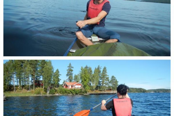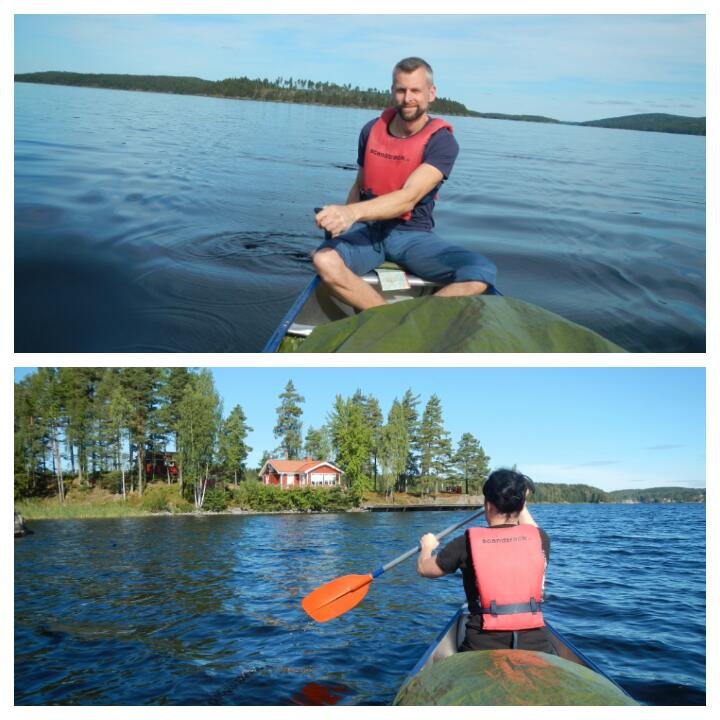 Der Himmel war grau und es regnete leicht. Nach einem Hotdog (für mich gab es ausnahmsweise einen vegetarischen Hotdog, was keine Selbstverständlichkeit war, denn ich hatte keine vegetarische Verpflegung gebucht - vielen Dank noch mal!!!) gingen wir durch ein kleines Wäldchen zum Outdoorcamp Höglund, wo wir unsere Ausrüstung erhielten. Wir packten unsere Klamotten in die von Scandtrack bereitgestellten, wasserdichten Packsäcken, kontrollierten unser Equipment (Wichtig: Zelt probehalber aufbauen!!!) und begaben uns zum Bootssteg. Dort wurde uns schnell ein Kanu zugeteilt und wir waren gegen 12 Uhr schon auf dem See. Natürlich mit vorheriger Einweisung, welche auch für absolute Beginner leicht und verständlich ist.