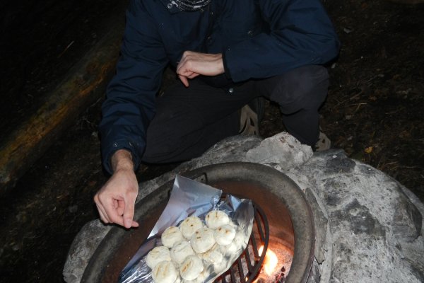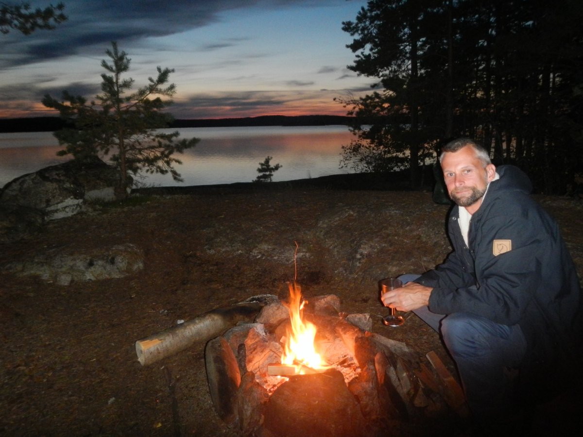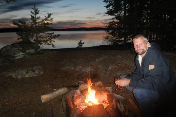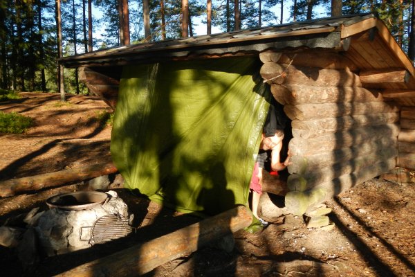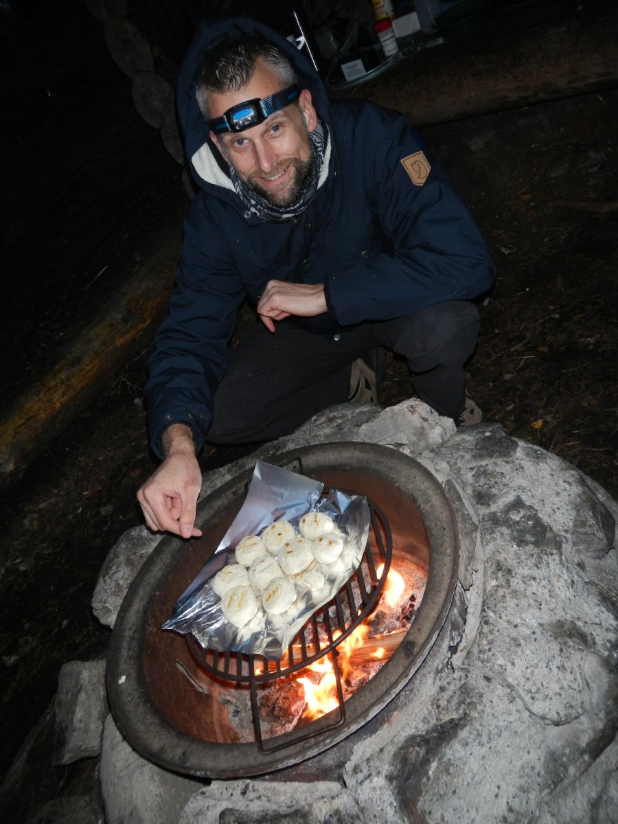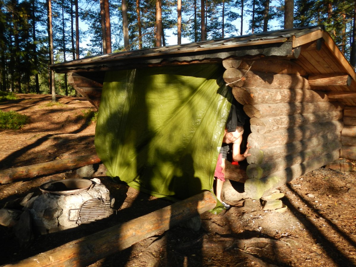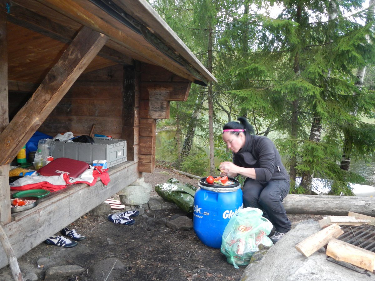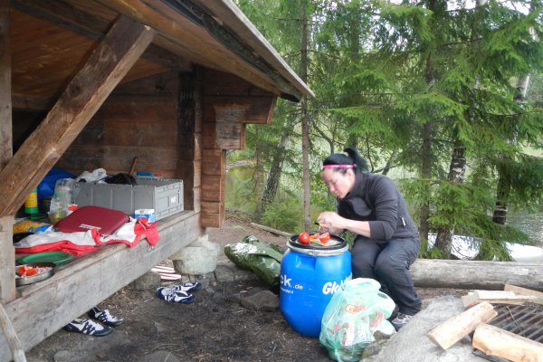 Zuhause hatten wir uns schon ein paar Gedanken über unsere Route gemacht. Einen Kanuwagen wollten wir nicht mieten, da wir keine Lust auf das „Umtragen“ des Kanus hatten. Die Schleusen waren leider saisonbedingt nicht mehr in Betrieb, so dass für uns nur Richtung Norden in Frage kam. Wir kamen an der Insel Skomsnäs mit dem Dano 15 vorbei. Da das Dano noch frei war, das Wetter nicht besser wurde und es immer noch recht ungemütlich feucht war, entschlossen wir uns, die erste Nacht in der Schutzhütte anstatt im Zelt zu verbringen. Wir richteten es uns gemütlich ein und trotzten so dem Nieselregen. Wir kochten uns erstmal eine Suppe aus der Lebensmitteltonne und genossen die ersten Stunden in der Wildnis. Während ich mich abends an einer Outdoorpizza versuchte, in dem ich aus Mehl, Backpulver, Öl, Wasser einen Teig knetete, welcher dann mit Zwiebeln, Tomaten, Salami (für Andi) und Käse belegt wurde, kümmerte sich Andi um das Lagerfeuer, auf dem wir die Pizza dann knapp über dem Feuer backten. Da ich zu viel Teig zubereitet hatte, formte ich noch einige Brötchen für den nächsten Morgen. Die Pizza hat übrigens sensationell geschmeckt und es sollte noch ein romantischer erster Abend mit einem Gläschen Wein am Lagerfeuer werden. Gegen 21:30 Uhr schlüpften wir in unsere Schlafsäcke im Dano und schliefen zügig ein.
