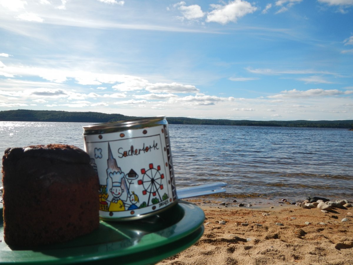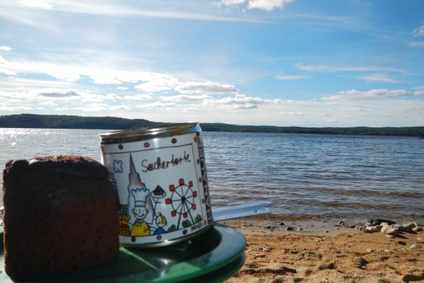 Sonntag, 06.09.15: Als wir gegen 08 Uhr wach wurden, trauten wir unseren Augen nicht: die graue Wolkendecke hatte sich über Nacht verzogen und es war wolkenloser Himmel. Zwar wehte ein ordentliches Lüftchen, aber die Sonne strahlte traumhaft. Andi meinte:“ Wer weiß wie es die nächsten Tage wird. Lass uns, auch wenn es sch…. kalt ist, in den See springen.“ Gesagt, getan. Erst war es schrecklich kalt, nach dem eintauchen aber sooooo schön und erfrischend. Unbeschreiblich!!! Danach frühstückten wir die selbst gemachten Brötchen, u.a. mit Nutella und warmer Milch mit Müsli. Heißer Kaffee durfte natürlich auch nicht fehlen. Es war ein richtig toller Start in den Tag. Gegen 11:30 Uhr hatten wir alles soweit zusammengepackt und saßen im Kanu.