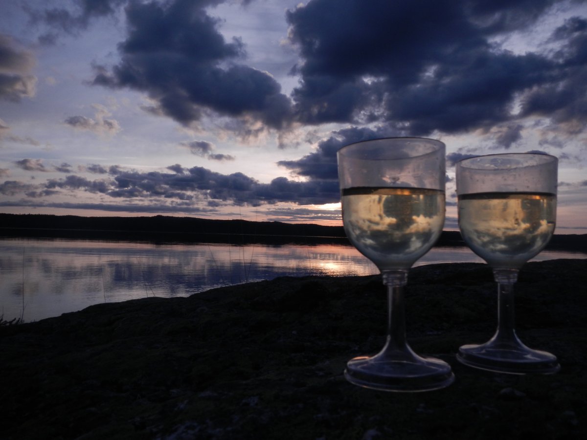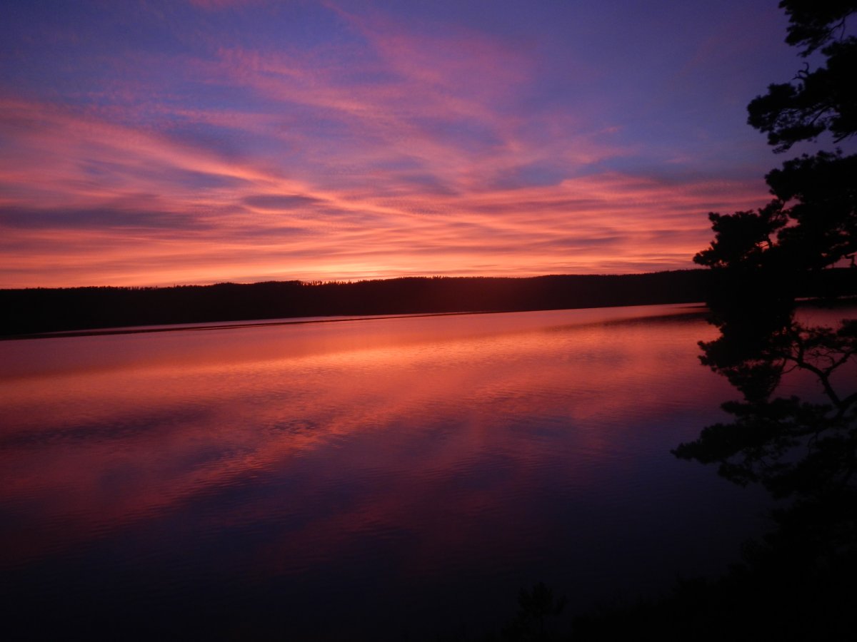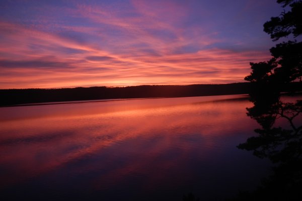 Am nächsten Morgen, es war schon Donnerstag, wurde ich von einem rascheln in den Büschen wach. Danach folgte ein plätschern im See. Irgendwas war da draußen, ganz in der Nähe unseres Zeltes. Vielleicht ein Elch? Ich kroch vorsichtig aus dem Schlafsack und öffnete leise das den Reißverschluss des Moskitonetz. Es war noch dämmrig und ein dicker Nebelschleier lag über den See. Ich schlich barfuß in die Richtung, aus der immer noch ein rascheln kam. Mittlerweile lugte auch mein Mann total verschlafen aus dem Zelt. Ich schlich weiter Richtung dem rascheln und sah…. ein Eichhörnchen… oh wie schade. Ich hätte so gern einen Elch gesehen… Wir schliefen dann nochmal ein und frühstückten gegen 09:30 Uhr. Der Nebel verzog sich nur langsam. Gegen 11:30 Uhr war das Wetter wieder absolut perfekt: blauer Himmel, kaum Wind und der Nebel war verschwunden. Es ging wieder zurück Richtung Norden. Auf Tröllön machten wir eine kurze Kekspause und erreichten gegen Nachmittag die Insel mit dem Dano 12.Wir schlugen unser Zelt dort an der Südwestseite auf. Ein traumhafter Platz zum Sonnen! Wir gingen sogar noch baden. Abends kochten wir uns eine große Portion Bratkartoffeln. Der Sonnenuntergang war wieder wunderschön!