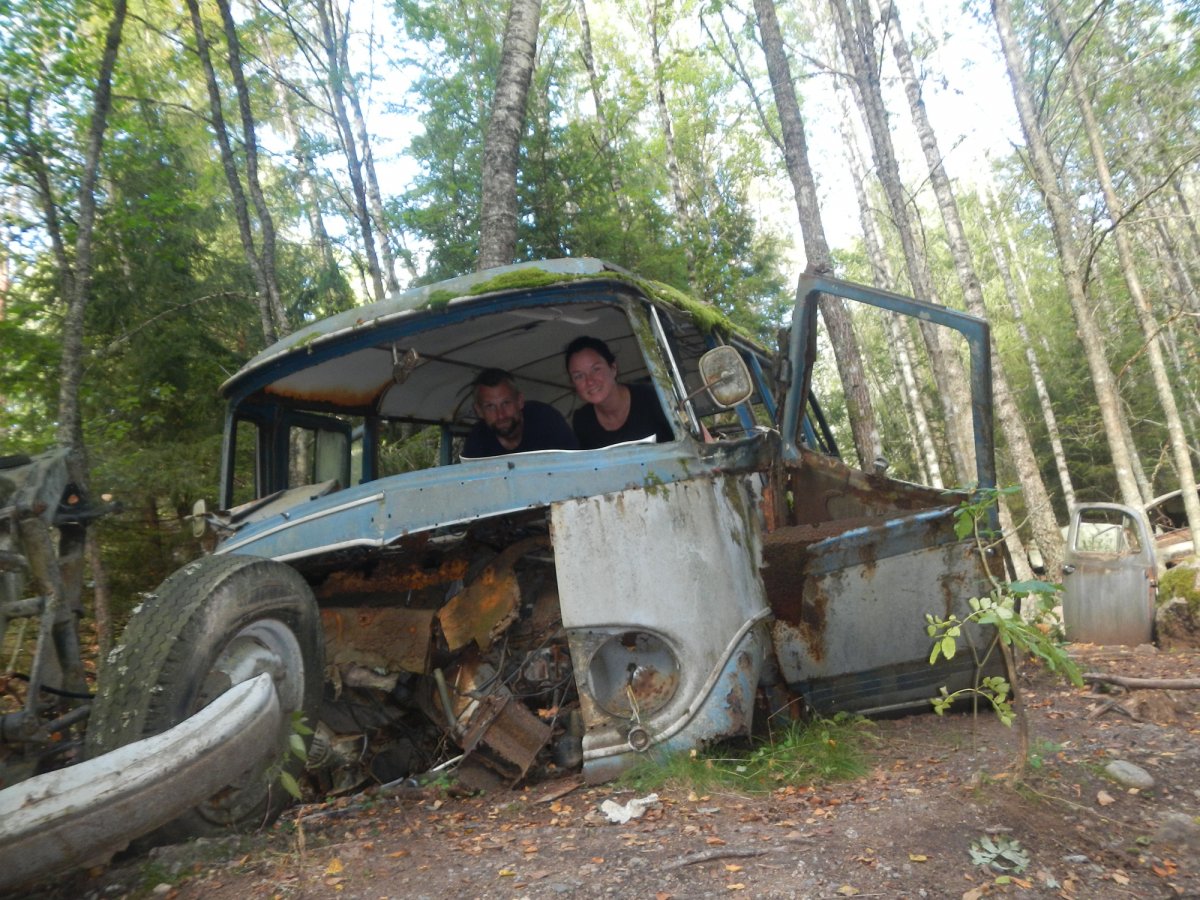Jetzt war leider schon Freitag (11.09.2015),der letzte Tag. Nach einem guten Frühstück entschlossen wir uns nochmal über den Foxen zu fahren. Letztes Jahr besuchten wir schon den Autofriedhof bei Båstnas und wollten dort noch einmal hin. Mitten im Wald stehen dort unendlich viele Autos, die vor sich hin gammeln. Auch viele Käfer sind darunter. Da ich ein großer VW Käfer-Fan bin, ist es immer wieder interessant zu sehen, wie viele dort vor sich hin rosten. Einerseits traurig aber besser als in eine Schrottpresse zu gelangen Wir fanden in einem der Autos auch noch eine alte Zeitung vom 17. Januar 1975. Der letzte Tag verging leider viel zu schnell.
