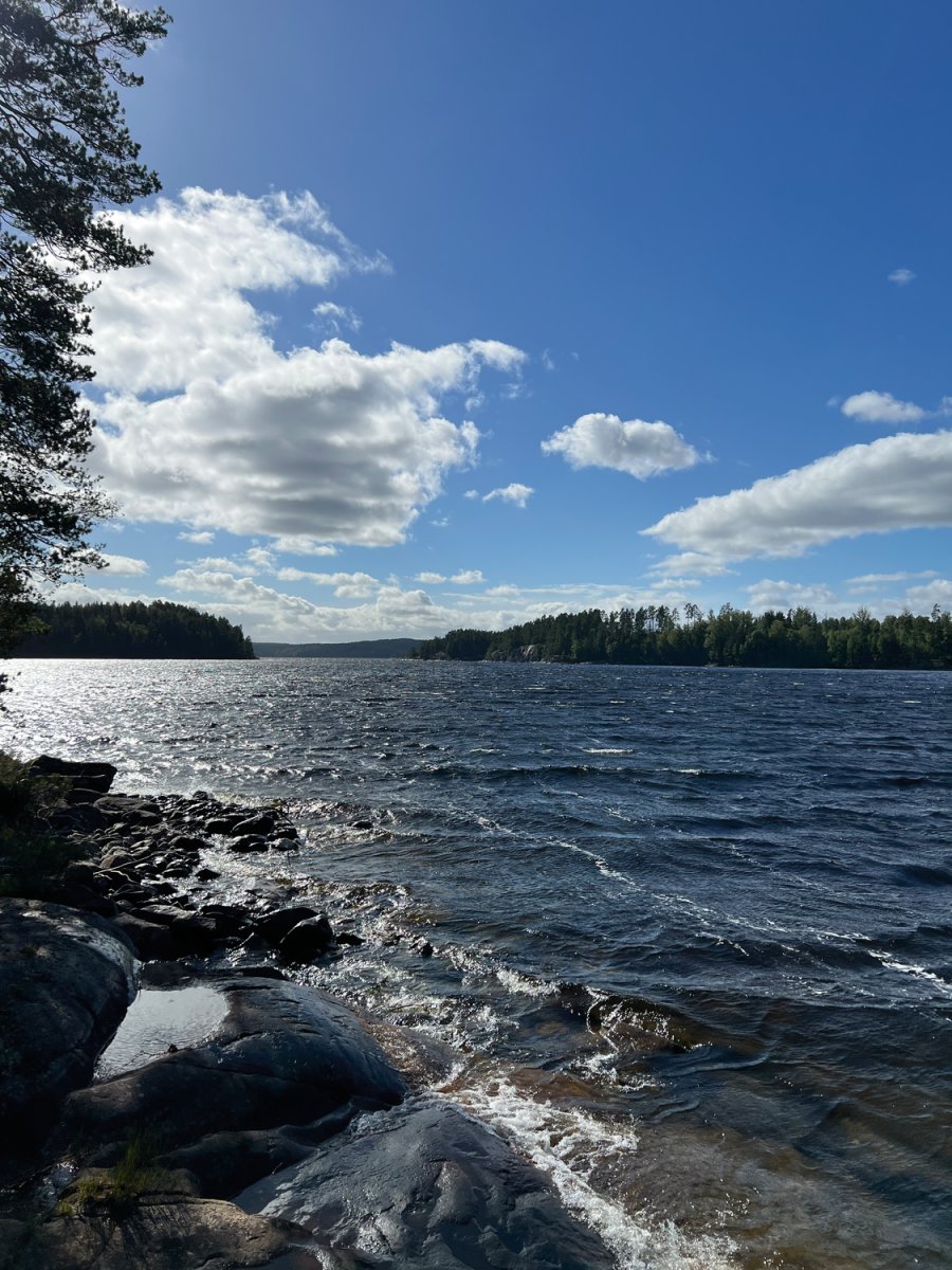 Nach einem ausgiebigen Frühstück machten wir uns auf den Rückweg Richtung Süden. Bevor wir ablegten, schlenderten wir noch ein letztes Mal um die wunderschöne Insel. Beim Einsteigen ins Kanu passierte mir jedoch ein kleines Missgeschick: Ich versuchte, über die Steine im Wasser abzukürzen, rutschte dabei ab und durchnässte meine Schuhe bis auf die Socken erneut.