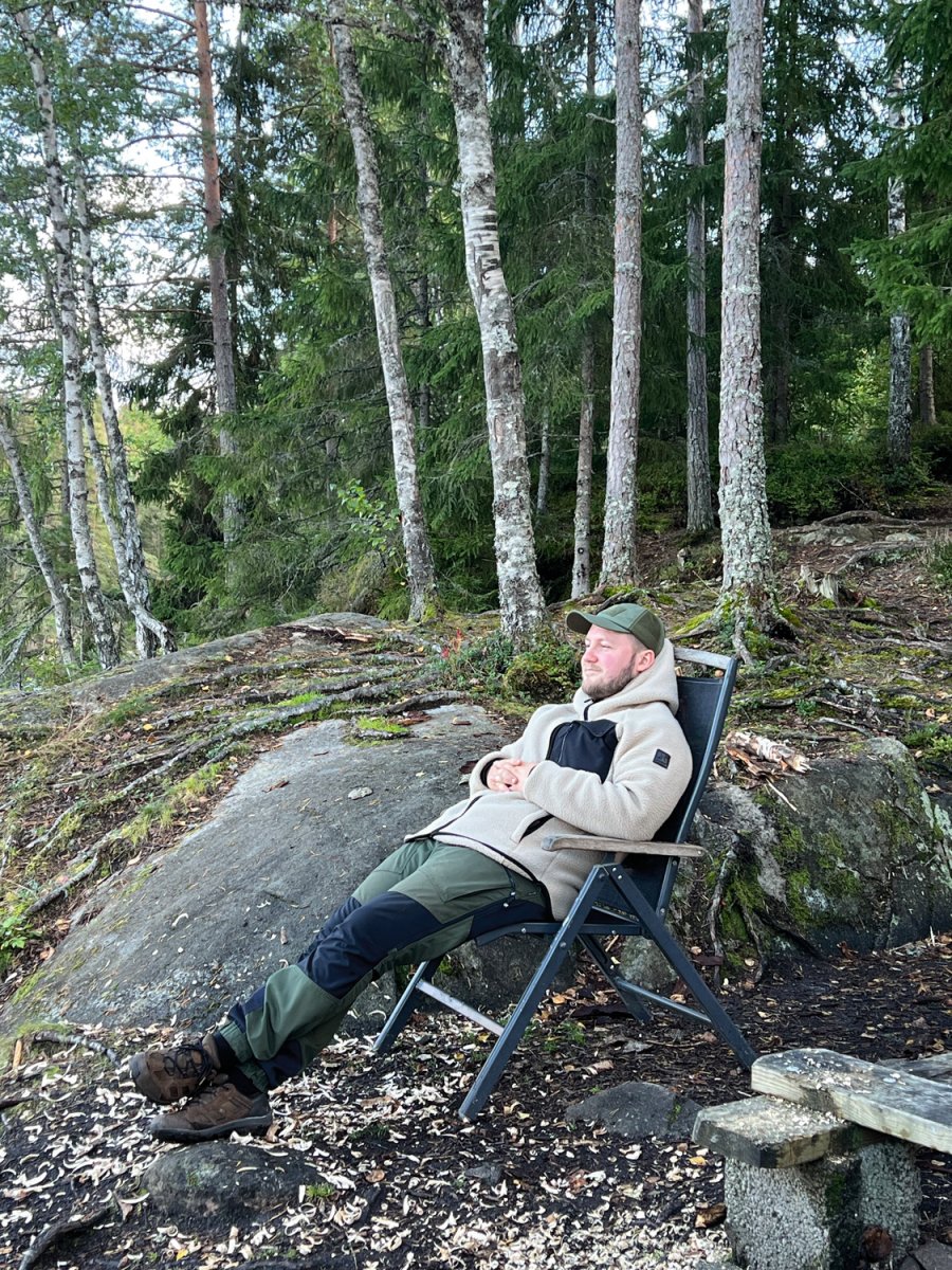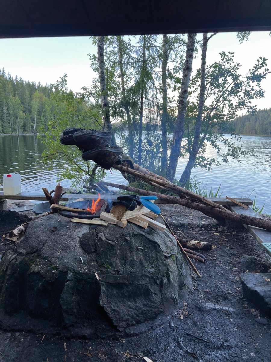 Kaum angekommen, entzündeten wir ein Feuer an der Feuerstelle und schnitzten Stöcke, um unsere nassen Klamotten und Schuhe zum Trocknen aufzuhängen. Die Stunden vergingen wie im Flug, und als wir das nächste Mal auf die Uhr sahen, war es bereits 19:30 Uhr. Nach einem ausgiebigen Abendessen erkundeten wir die Insel und fanden einen verlassenen Klappstuhl, der uns eine kurze, erholsame Pause erlaubte. Die Möglichkeit, sich nach Tagen auf dem Boden oder Holzbrettern endlich mal wieder ordentlich anzulehnen, war einfach unbezahlbar.